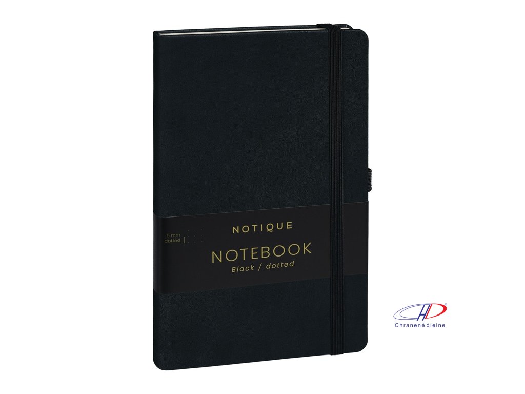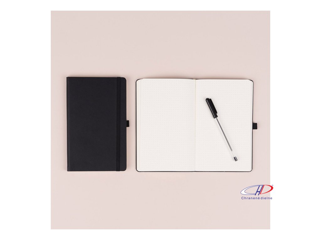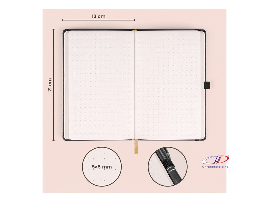 Linajkovaný (6 mm) alebo bodkovaný (5 mm) notes má povrch s hrubšou štruktúrou. Notes má pevnú knižnú väzbu a zaoblené rohy, pútko na pero, elastickú gumičku a textilnú záložku.