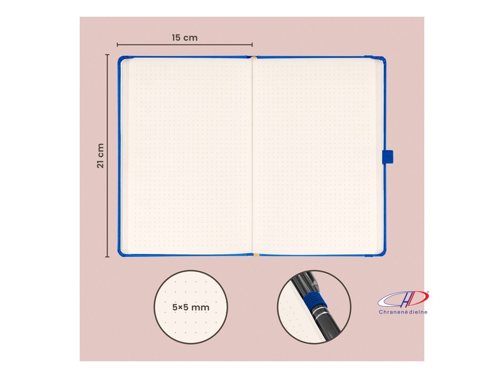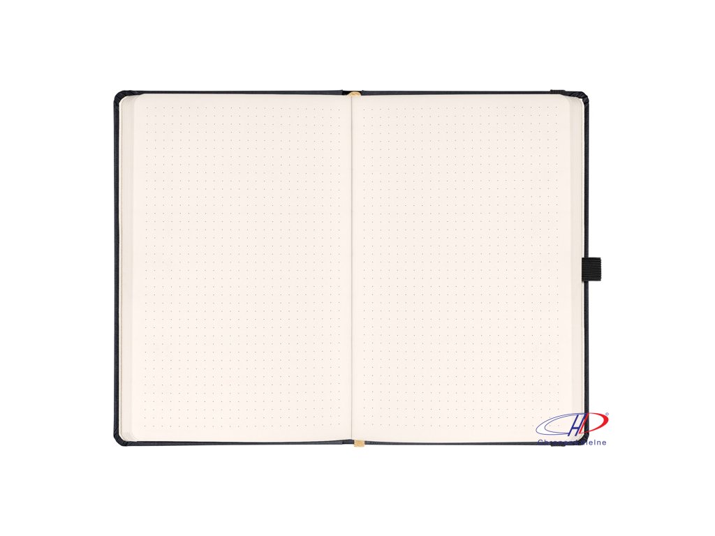 Bodkovaný notes Aprint. Klasika i elegancia, najžiadanejší povrch, na ktorý možno ľahko vyraziť firemné logá s jemnou štruktúrou. Pevná väzba s oblými rohami, pútko na pero, silná gumička, všitá záložka a vnútorné vrecko, 192 strán.