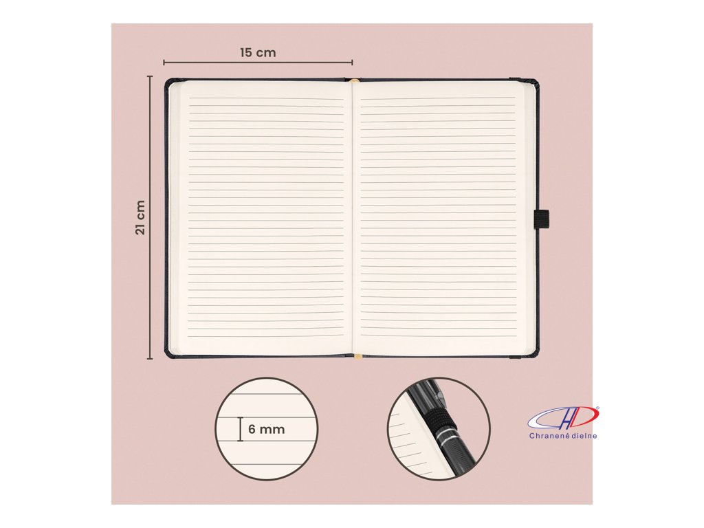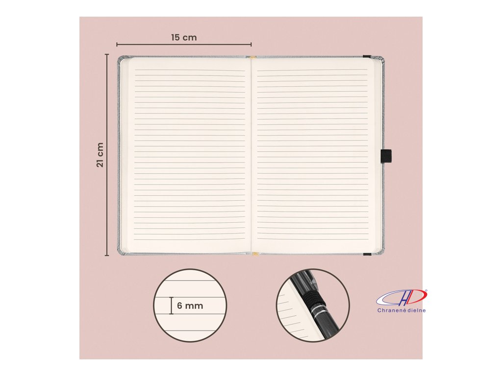 Linajkovaný notes Balacron. Povrch diára si získal obľubu vďaka kvalitnému vrchnému materiálu, ktorý je extrémne odolný voči vonkajšiemu poškodeniu. Pevná väzba s oblými rohami, pútko na pero, silná gumička, všitá záložka a vnútorné vrecko, 192 strán.