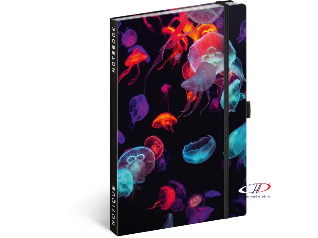 Linajkovaný notes v pevných doskách s uzatváraním na gumičku, pútkom na pero a vnútornou kapsou na navštívenky.