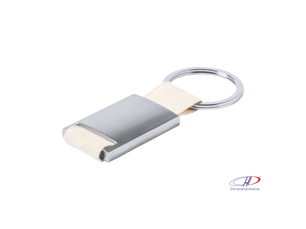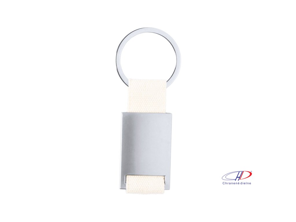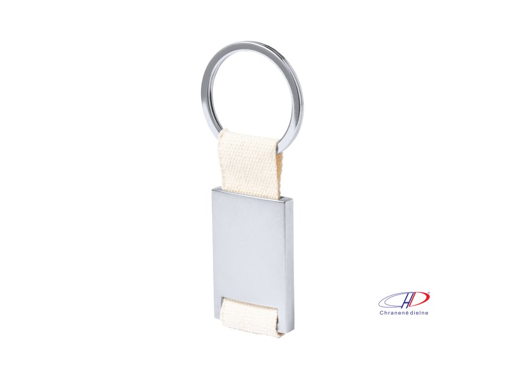 Obdĺžnikový kovový prívesok na kľúče s bavlneným pásikom.Doplňkové parametry