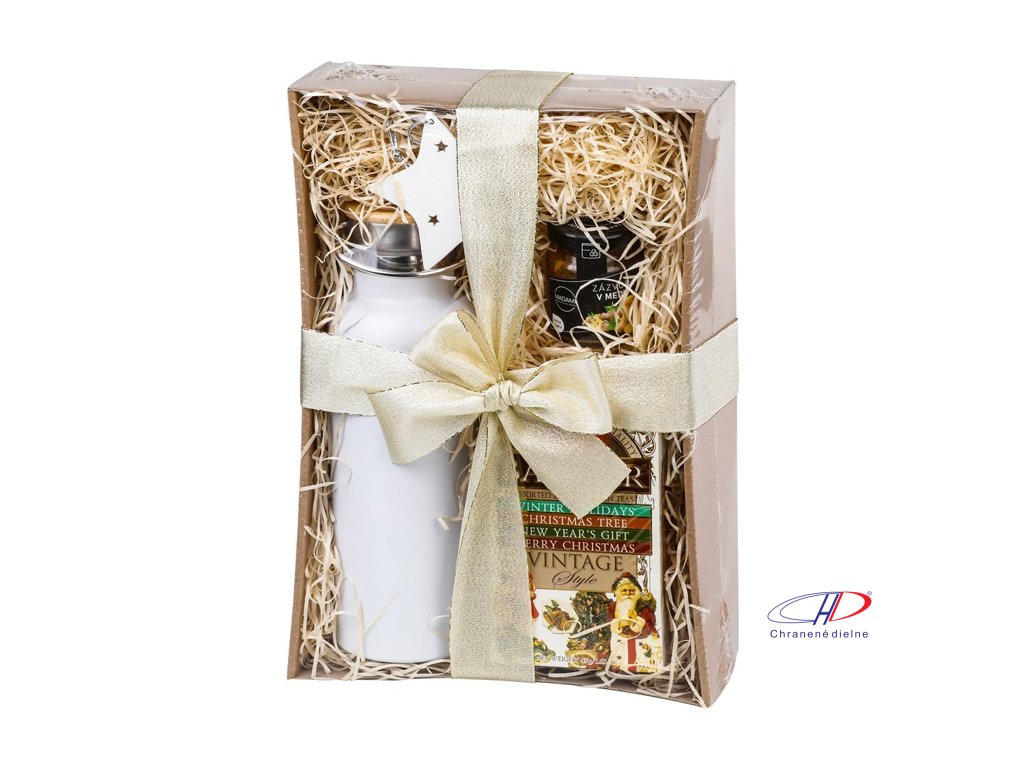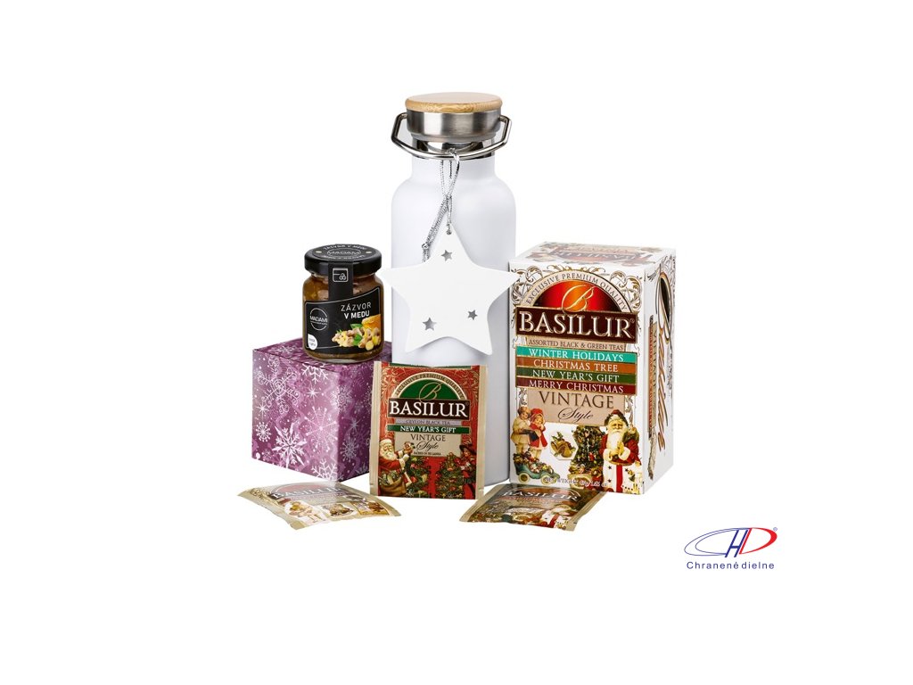 Darčekový set v krabici oviazaný zlatou stuhou. Obsahuje bielu nerezovú termofľašu so skrutkovacím vekom z nerezu a bambusu (570 ml), vianočný čaj Basilur Vintage (25 sáčkov), pohár zázvoru v mede (68 g) a drevenú ozdobu v tvare hviezdy (75 × 78 × 25 mm).Dodatočné parametre