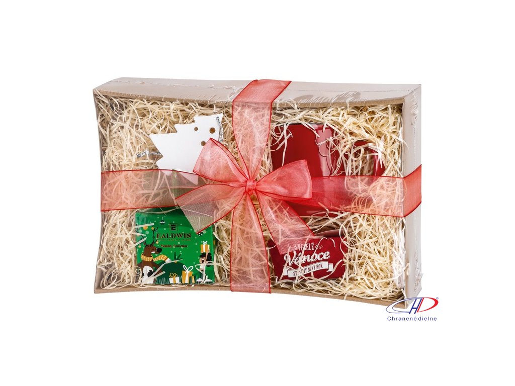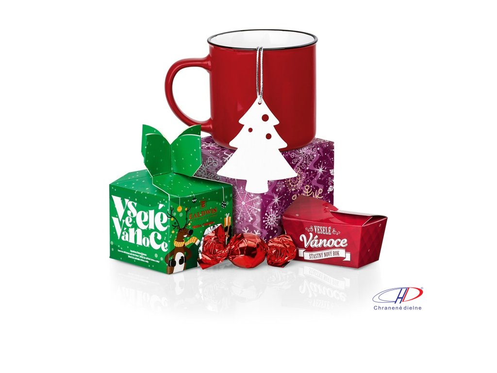 Darčekový set v krabici s červenou stuhou. Obsahuje červený keramický hrnček (340 ml), darčekovú krabičku 5 čajov Veselé vianoce (mix farieb: zelená, červená, modrá - nemožno vybrať), pralinky Veselé vianoce (28 g) a drevenú ozdobu v tvare stromčeka.Dodatočné parametre