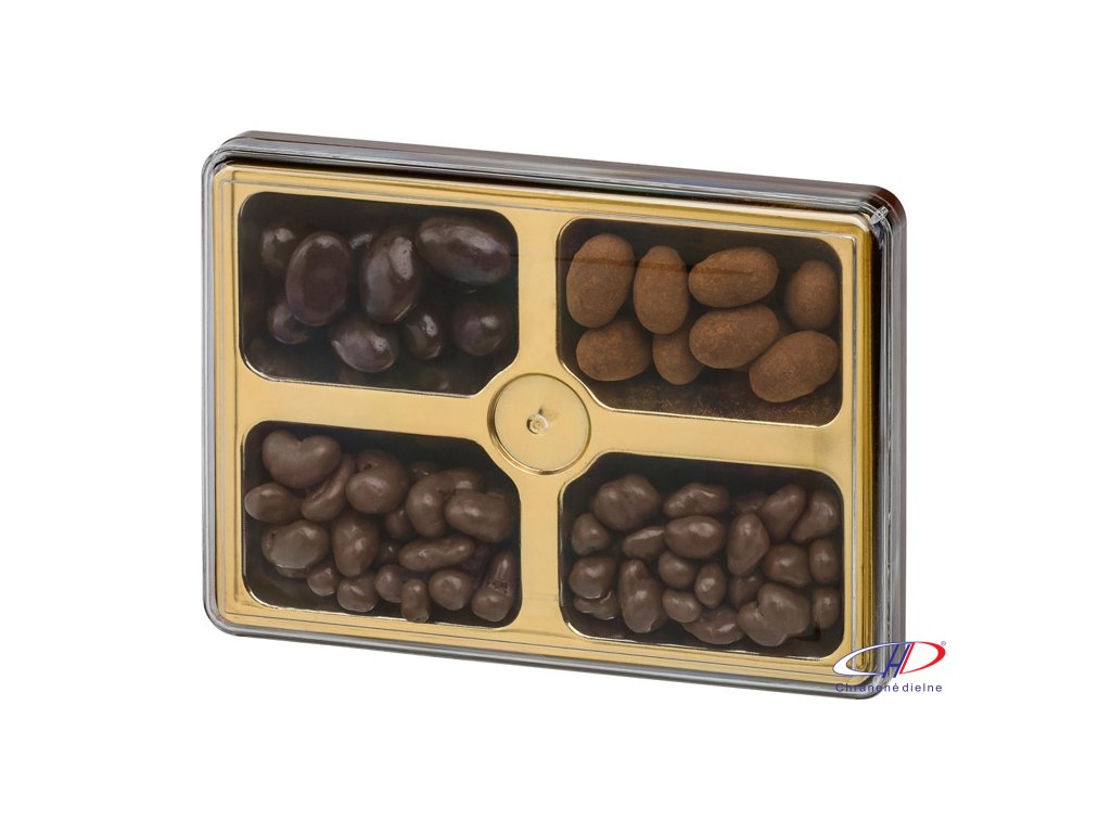 Darčeková krabička, 200 g. Obsahuje pražené mandľové jadrá v mliečnej čokoláde a škorice, pražené mandľové jadrá v horkej čokoláde, brusnice v mliečnej čokoláde a kešu oriešky v mliečnej čokoláde. V prípade záujmu o viac ako 10 kusov nás kontaktujte ohľadom cenovej ponuky.Dodatočné parametre