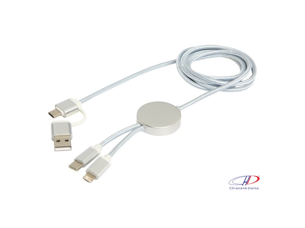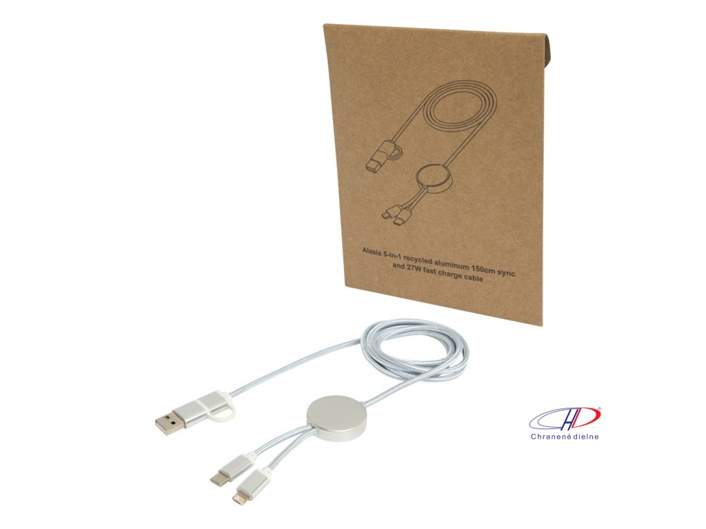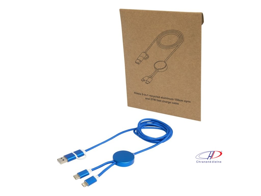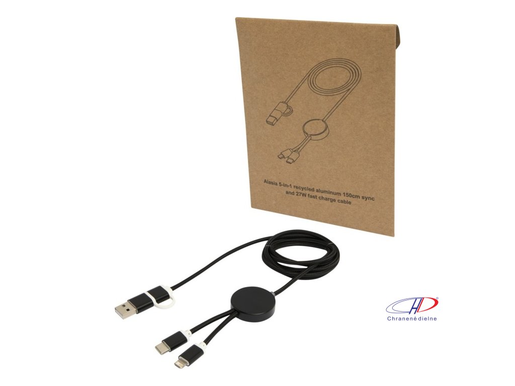 27W dátový synchronizačný kábel 5v1 pre rýchle nabíjanie. Vstupný konektor USB-A a USB-C, výstupný USB-C a Lightning/Micro USB. USB-A na USB-C výstupný výkon max 27W a ostatné pripojenia max 15W. Kompatibilný s CarPlay and Android Auto. Dĺžka: 150 cm.Dodatočné parametre