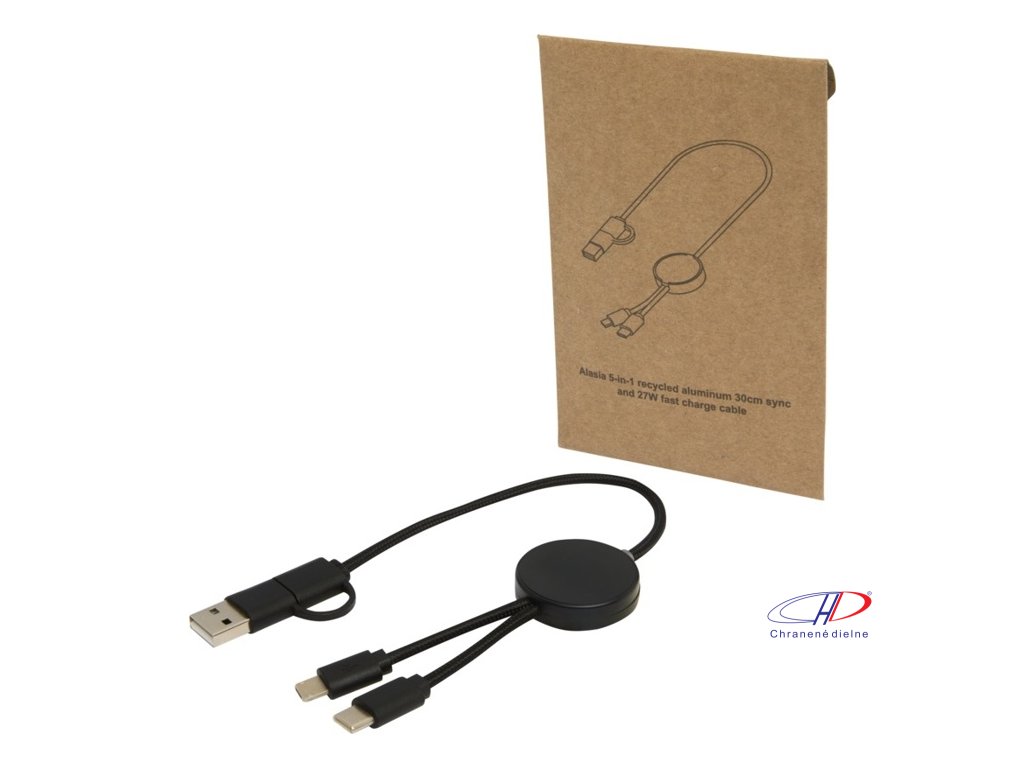 27W dátový synchronizačný kábel 5v1 pre rýchle nabíjanie. Vstupný konektor USB-A a USB-C, výstupný USB-C a Lightning/Micro USB. USB-A na USB-C výstupný výkon max 27W a ostatné pripojenia max 15W. Kompatibilný s CarPlay and Android Auto. Dĺžka: 30 cm.Dodatočné parametre