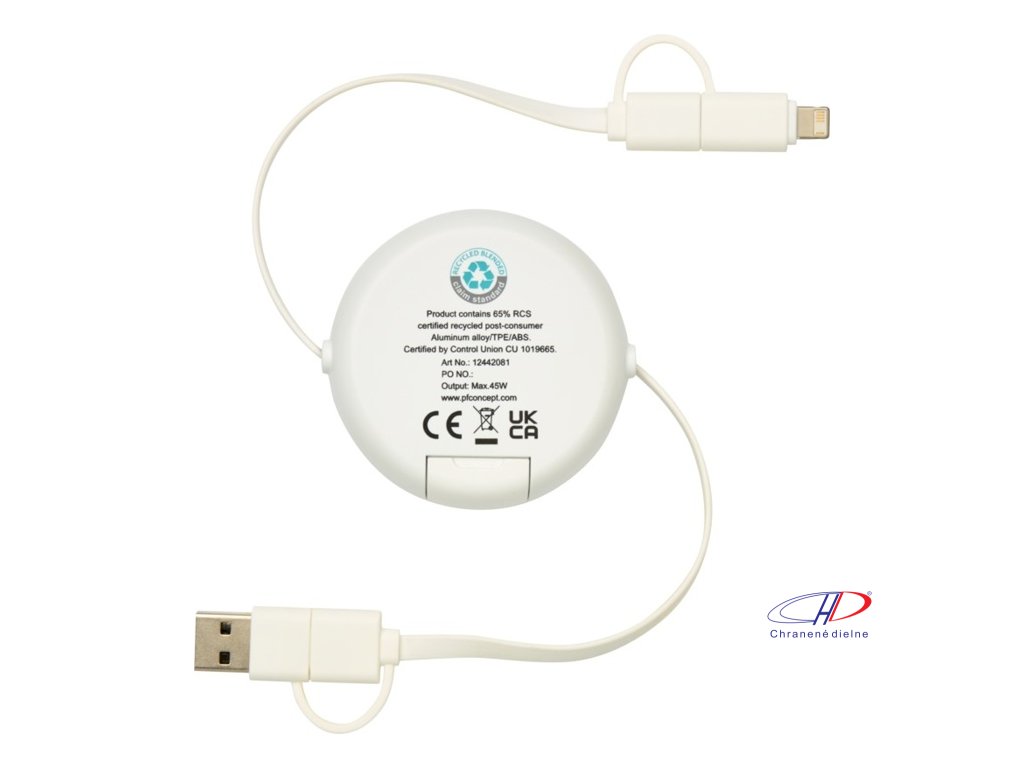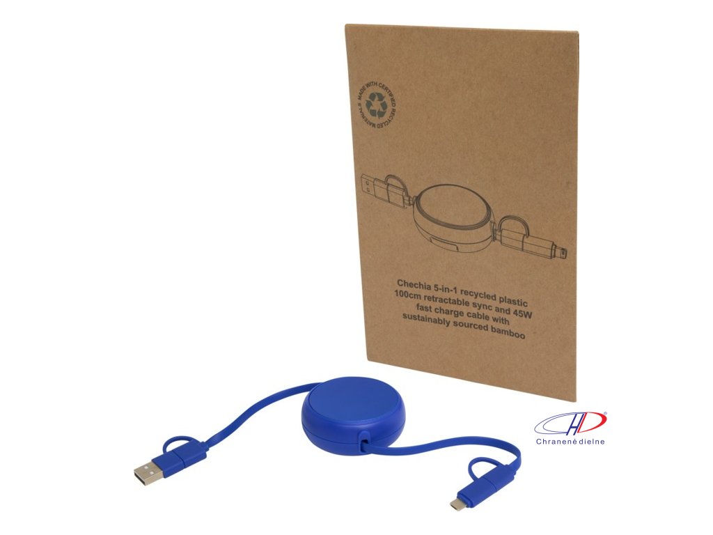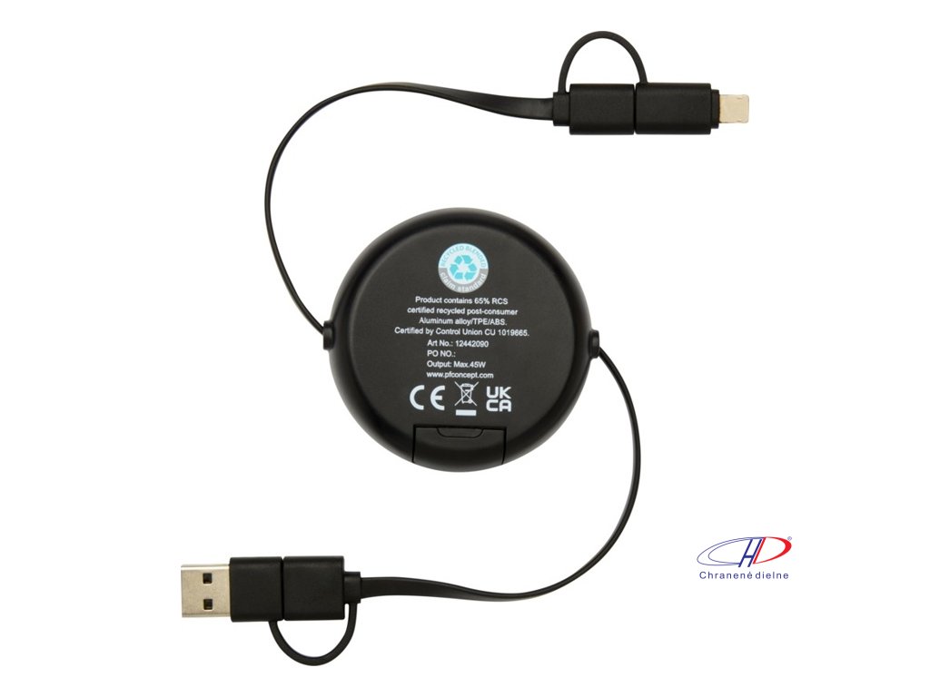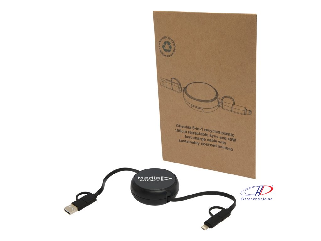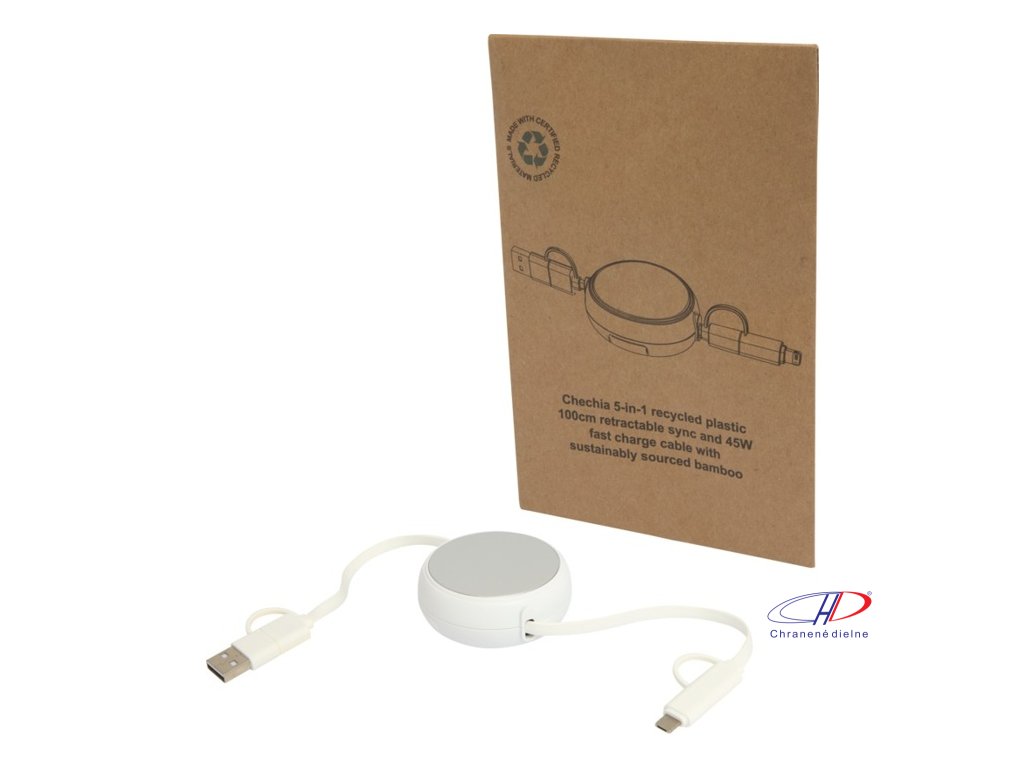 Synchronizačný dátový kábel 5v1 45W. Vstupný konektor USB-A a USB-C, výstupný konektor USB-C a Lightning/Micro USB 2 v 1. USB-C na USB-C poskytuje výstupný výkon max 45W, USB-A na USB-C max 24W a ďalši pripojenia max 15W. Dĺžka: 100 cm.Dodatočné parametre
