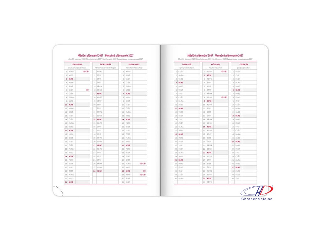 MINIMÁLNY ODBER 1 kus. Väzba: tuhá knižná s gumičkou a pútkom. Kalendárium: CZ/SK/GB/DE/HU/RU. Jemná štruktúra s atypickým reliéfom. Mesačný a ročný kalendár 2026/27, pracovný kalendár, sviatky, os.údaje, perforované rožky, priestor na poznámkyDodatočné parametre