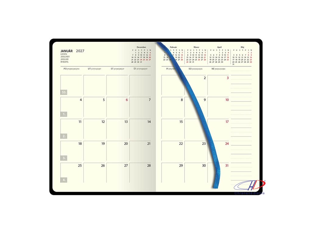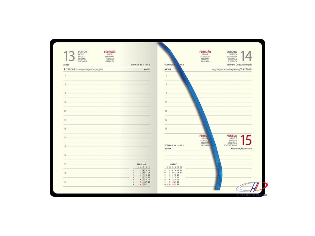 Denný diár s prehľadným kalendáriom na každý deň s pútkom a vloženým perom, gumičkou na uzatváranie a praktickým vreckom. Diár je v pevnej väzbe z ekologickej kože a s razbou roka. Kalendárium: SK/CZ-UK-DE-RU. Rozsah: 352 listov.Dodatočné parametre