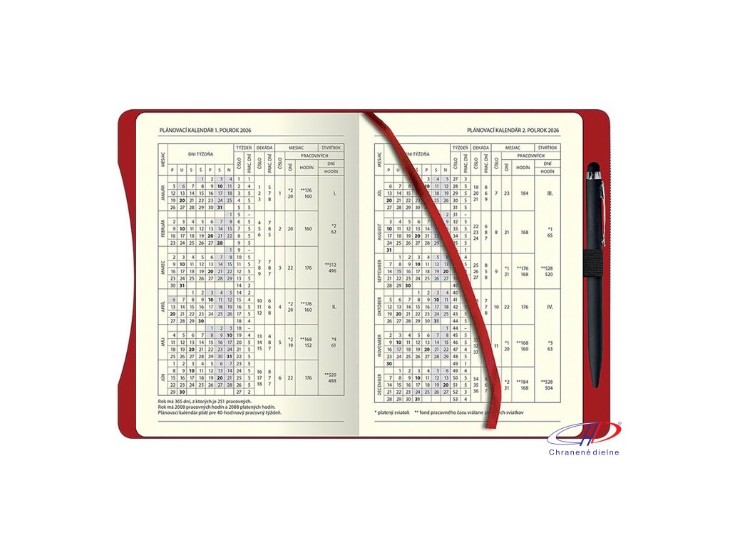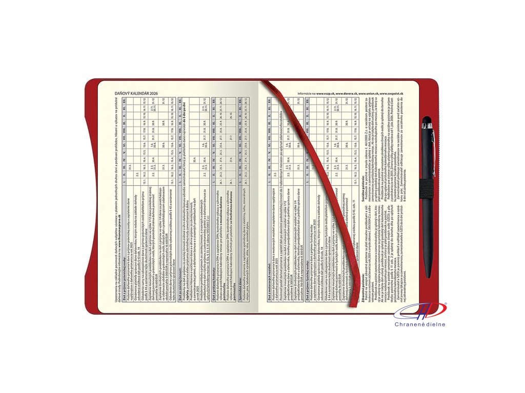Denný diár s prehľadným kalendáriom na každý deň s pútkom a vloženým perom. Diár je v pevnej väzbe z pogumovaného poťahu s razbou roka. Kalendárium: SK/CZ-UK-DE-RU. Rozsah: 352 listov.Dodatočné parametre