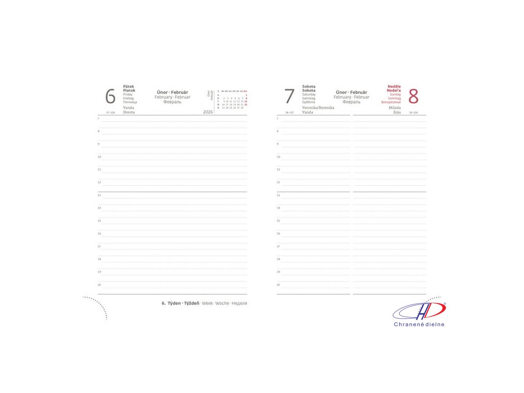 POVINNÉ BALENIE 5 kusov. Osobné údaje, mesačný prehľad, plánovací kalendár, predvoľby, sviatky ČR a SR, medzinárodné sviatky, ročný výhľad, denný layout, adresár, mapa Európy, ČR a SR. 336 strán.Dodatočné parametre