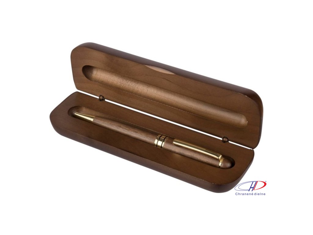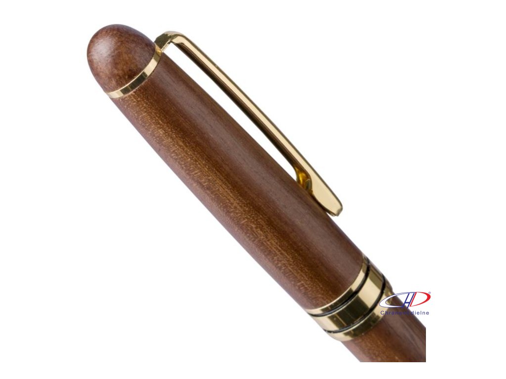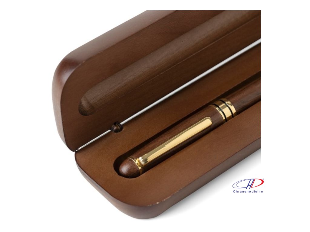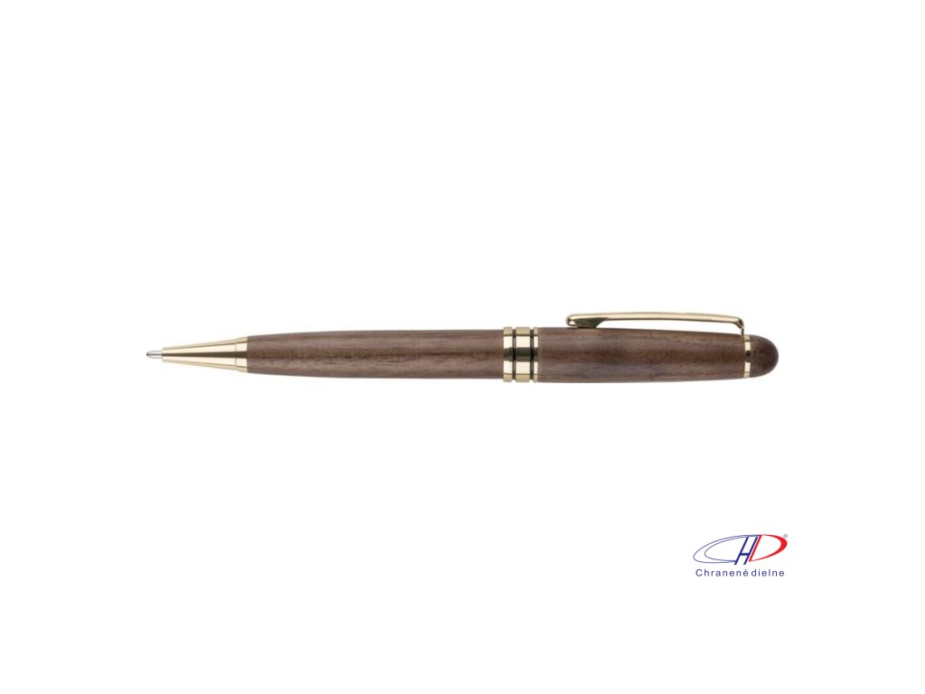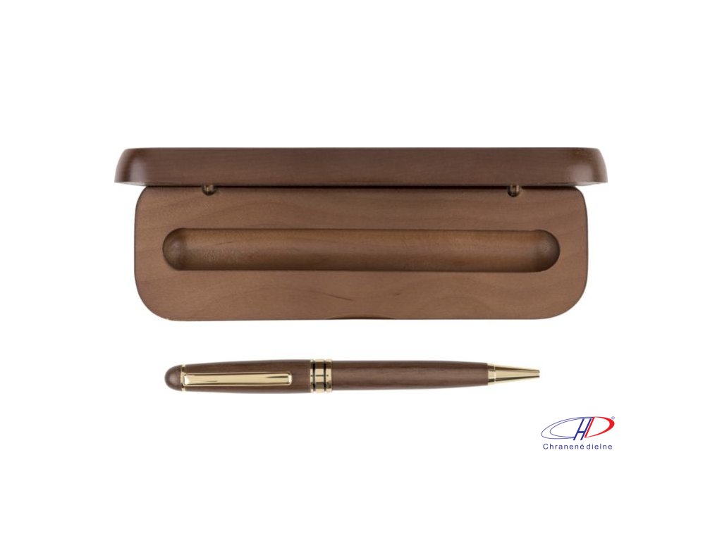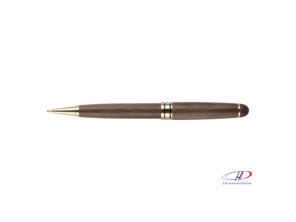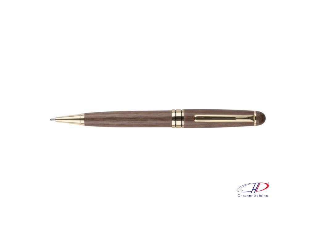 Otočné guľôčkové pero z orechového dreva a mosadze s kovovou špičkou, klipom a ozdobným lemom. Nemecký atrament Dokumental s približnou dĺžkou písania 1 000 metrov. Balené v javorovej drevenej krabičke a hnedej kartónovej krabičke. Modrá náplň.Dodatočné parametre