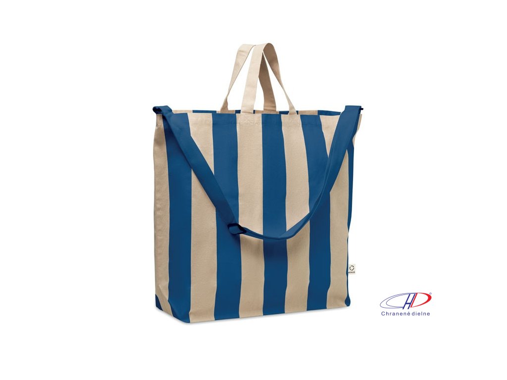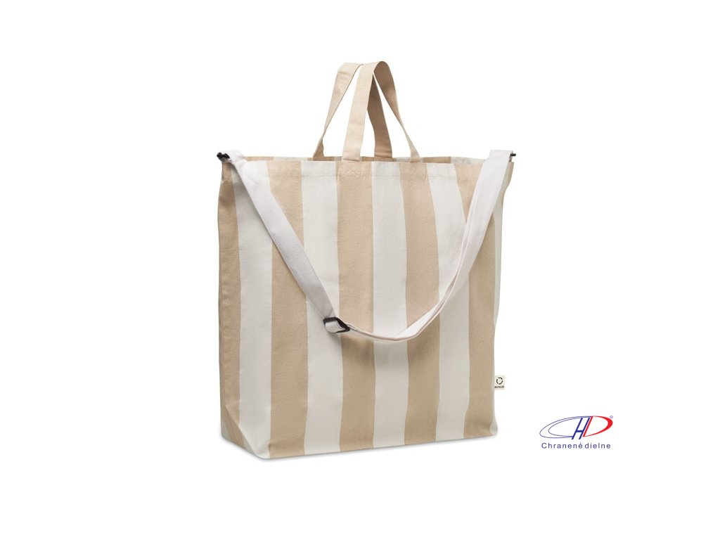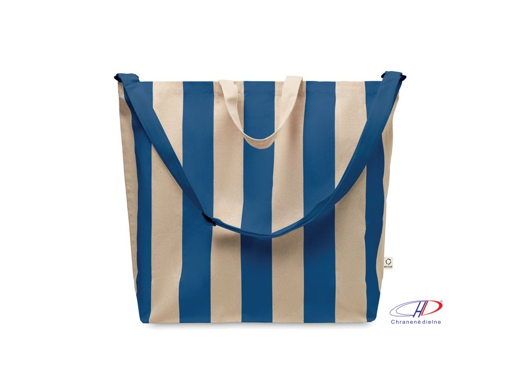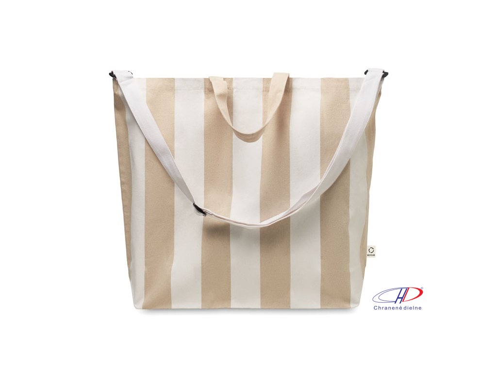 Extra veľká pruhovaná plážová taška z 280 g/m2 recyklovanej bavlny (80 %) a recyklovaného polyesteru (20 %) s vnútorným vreckom. Krátke rúčky a jeden veľký nastaviteľný ramenný popruh.Dodatočné parametre