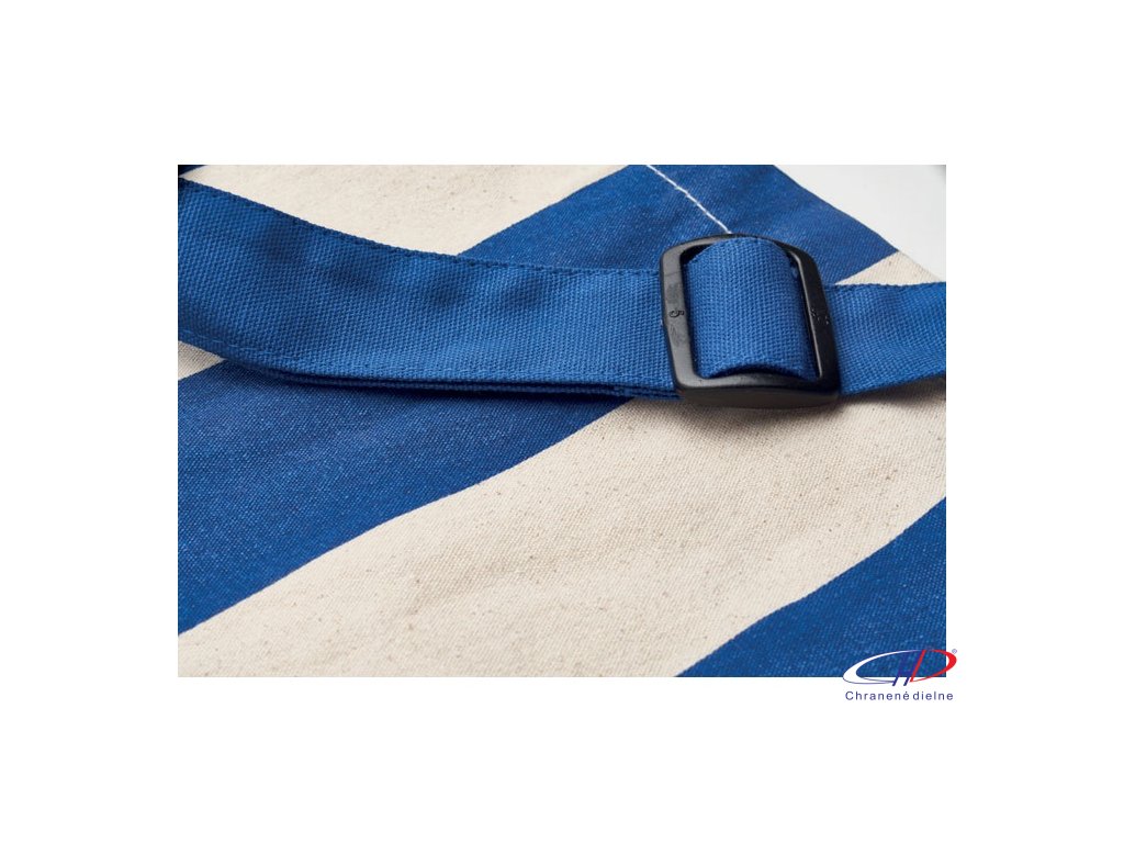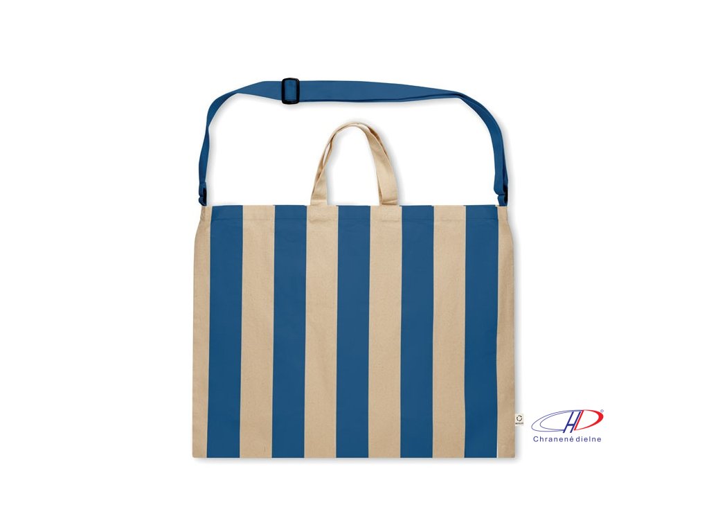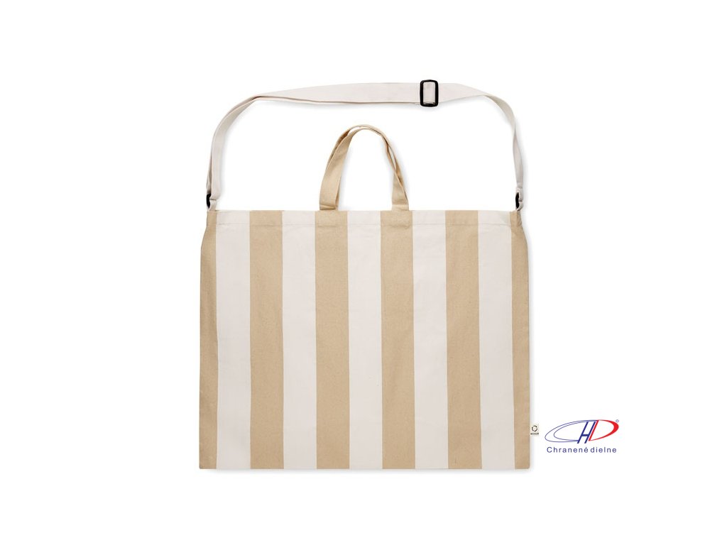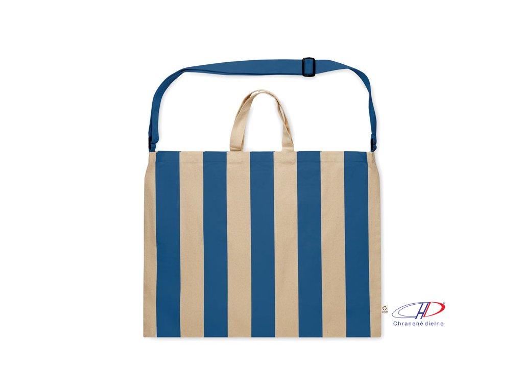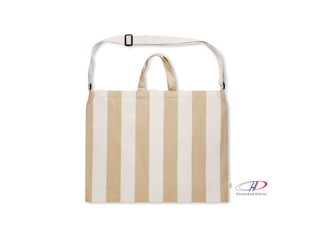 Extra veľká pruhovaná plážová taška z 280 g/m2 recyklovanej bavlny (80 %) a recyklovaného polyesteru (20 %) s vnútorným vreckom. Krátke rúčky a jeden veľký nastaviteľný ramenný popruh.Dodatočné parametre
