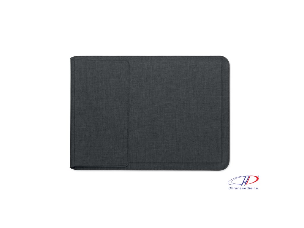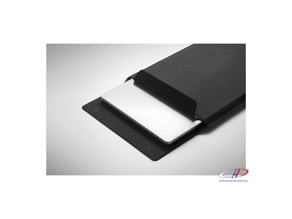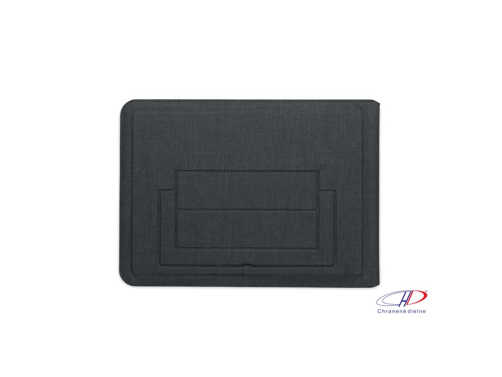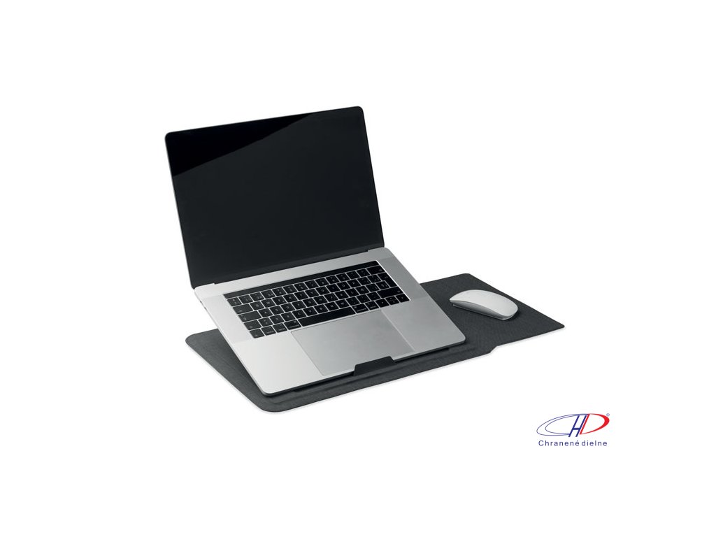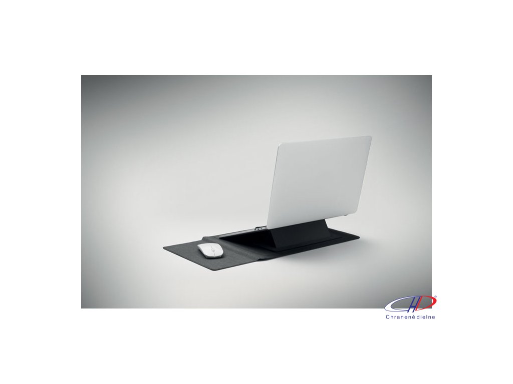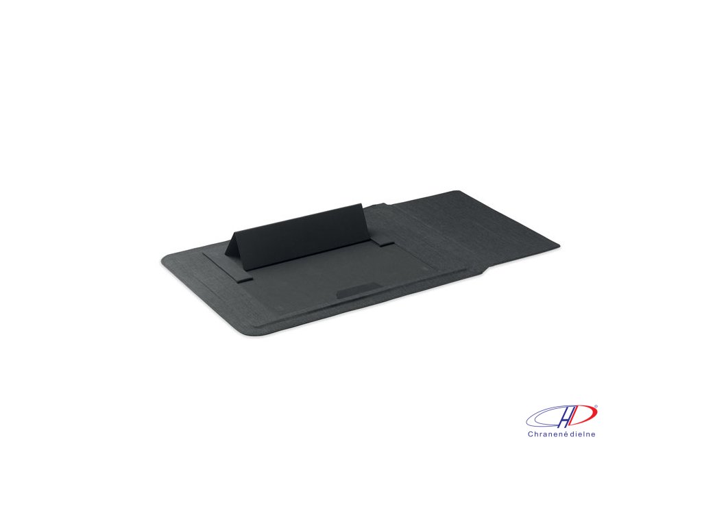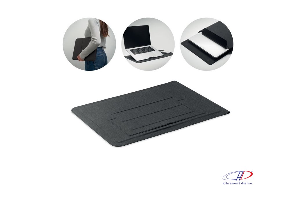 Puzdro na notebook 3v1 z RPET s rozmerom 16 palcov, stojanom na notebook a podložkou pod myš v rozloženom stave.Dodatočné parametre