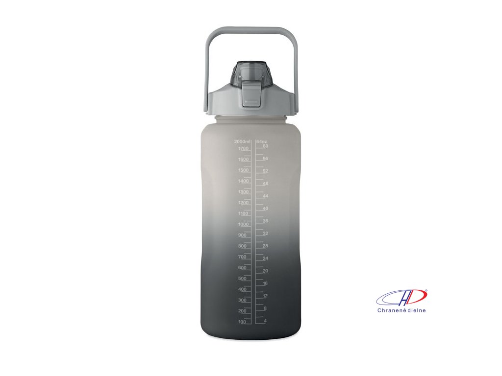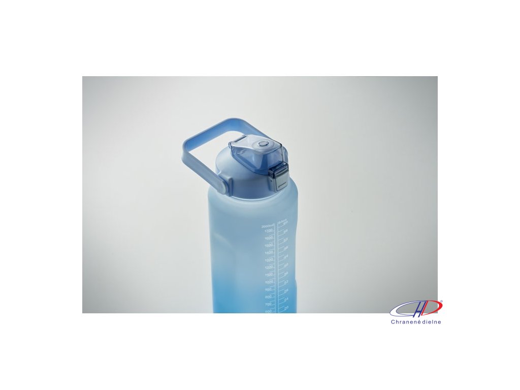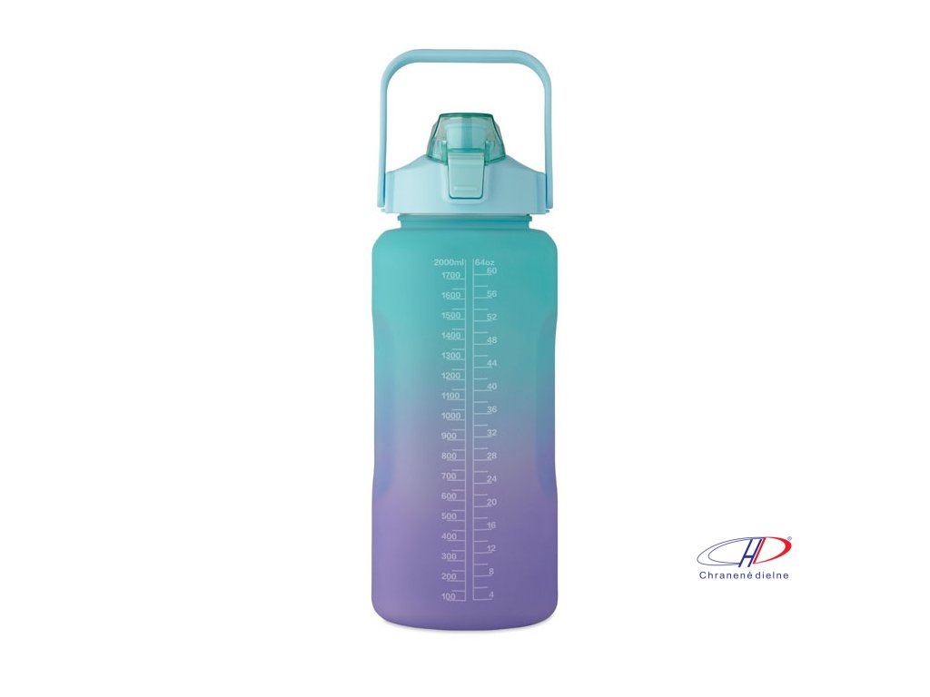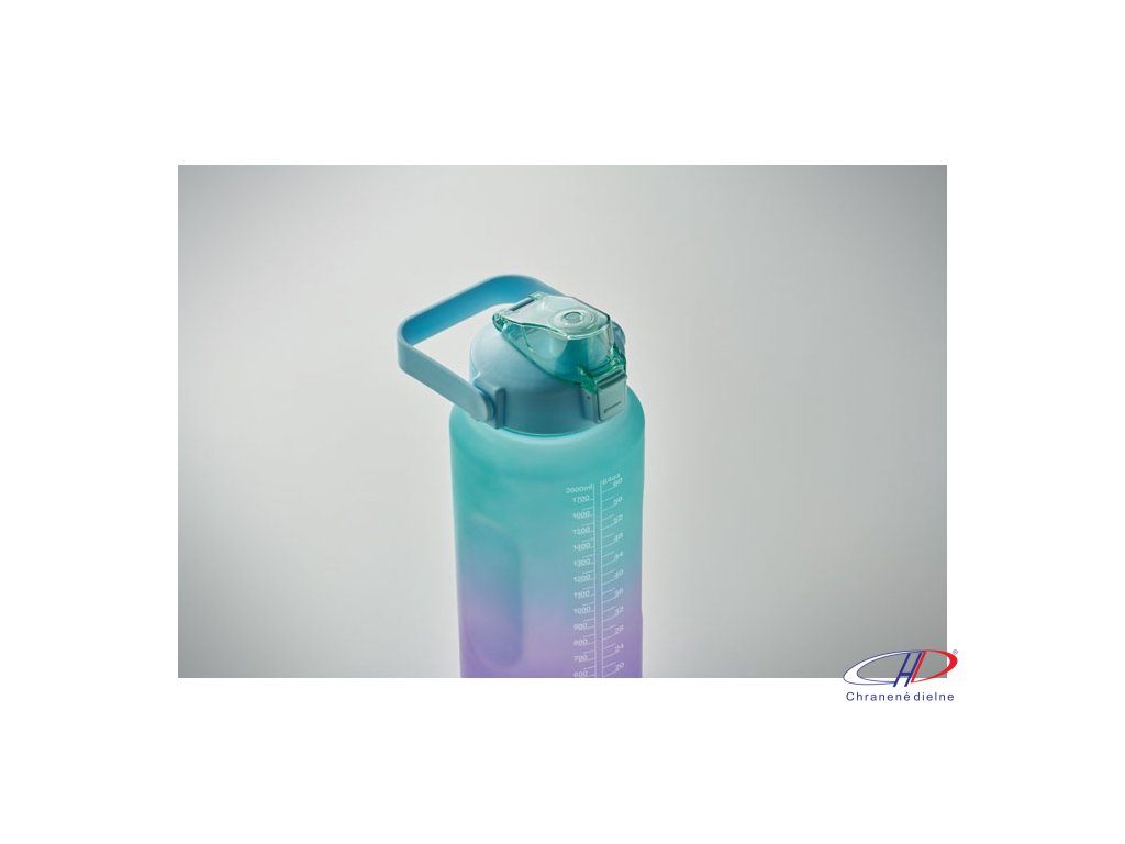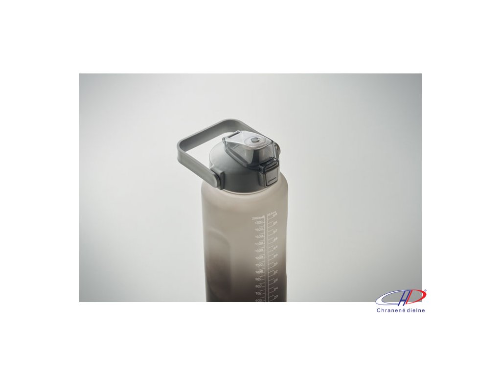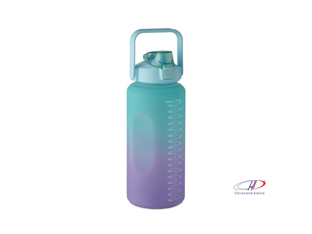 Motivačná fľaša na vodu z RPET. Má otvárateľné viečko s jednou rukou, slamkou, bezpečnostný zámok a rukoväť. Nepriepustná. Objem: 2000 ml.Dodatočné parametre
