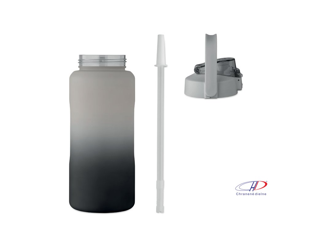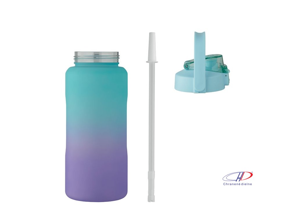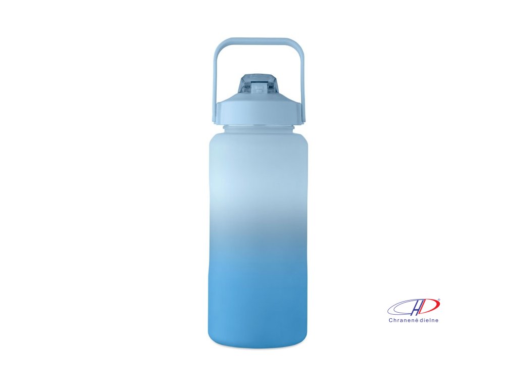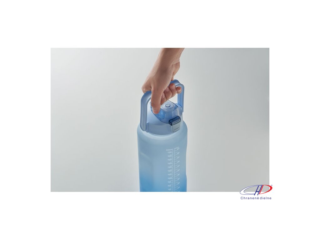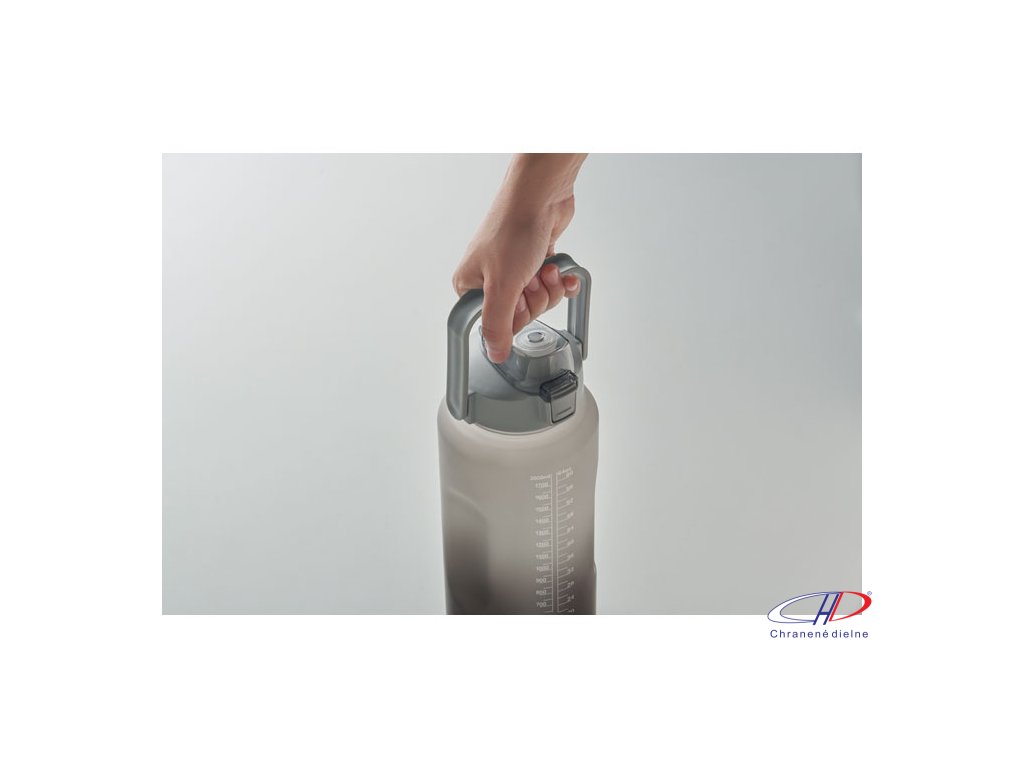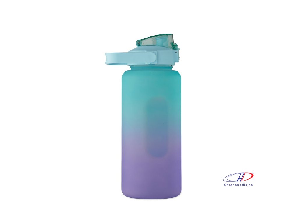 Motivačná fľaša na vodu z RPET. Má otvárateľné viečko s jednou rukou, slamkou, bezpečnostný zámok a rukoväť. Nepriepustná. Objem: 2000 ml.Dodatočné parametre