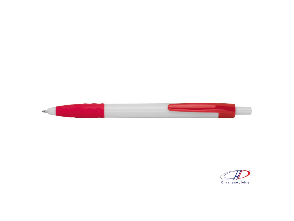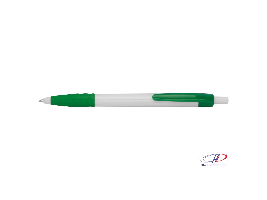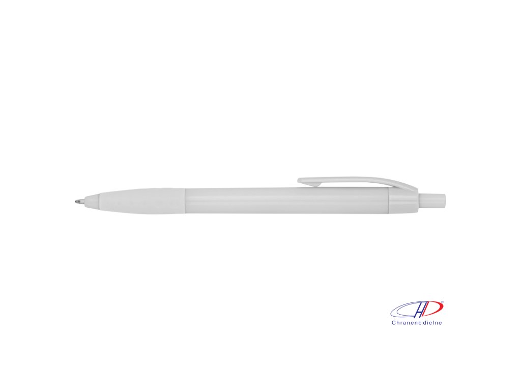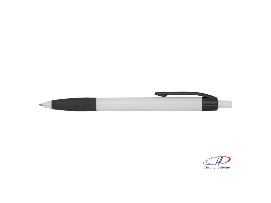 Plastové guľôčkové pero s čiernou náplňou na písanie. Biele telo, farebný klip a farebná časť na uchopenie.
