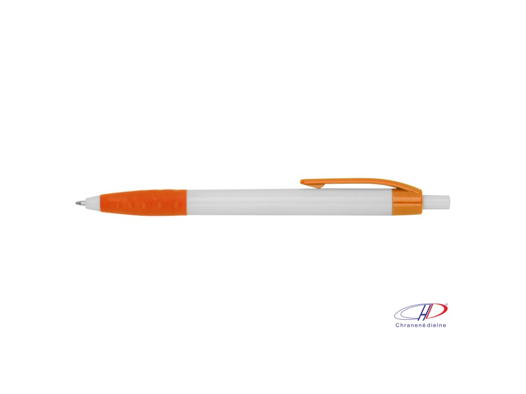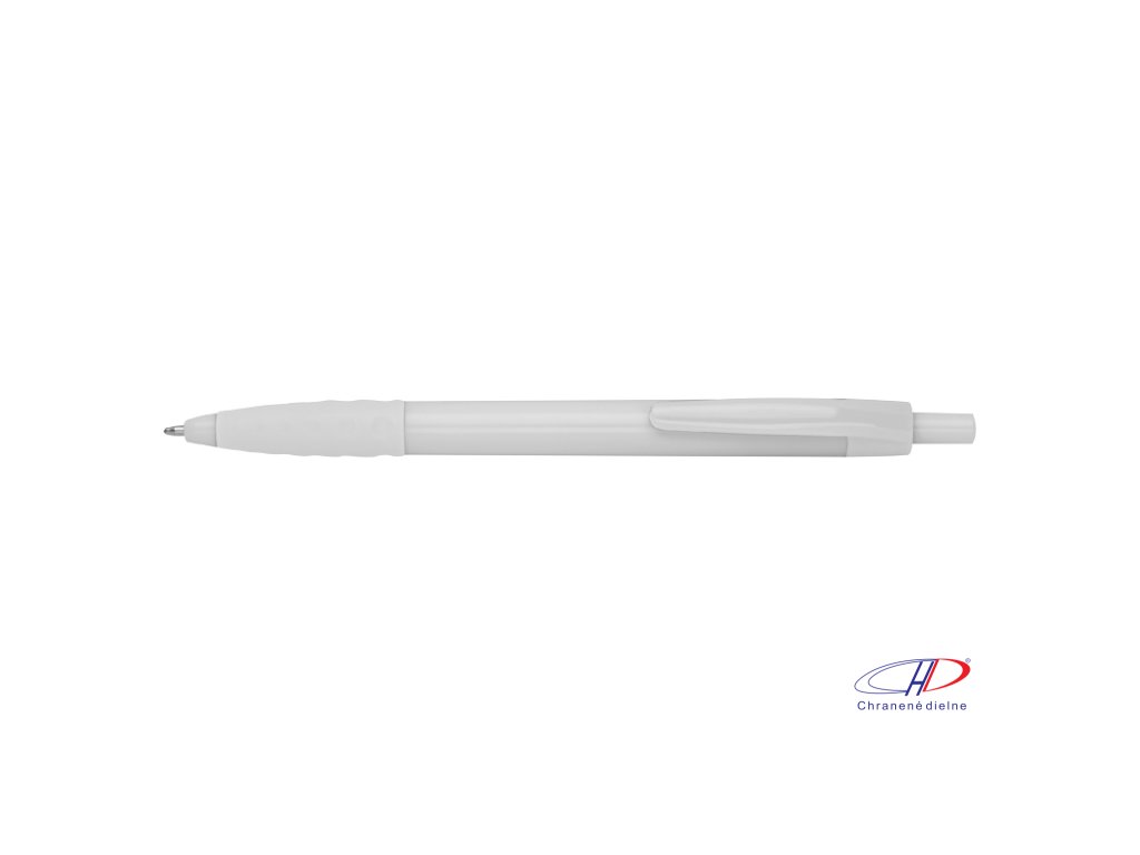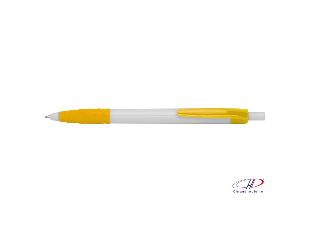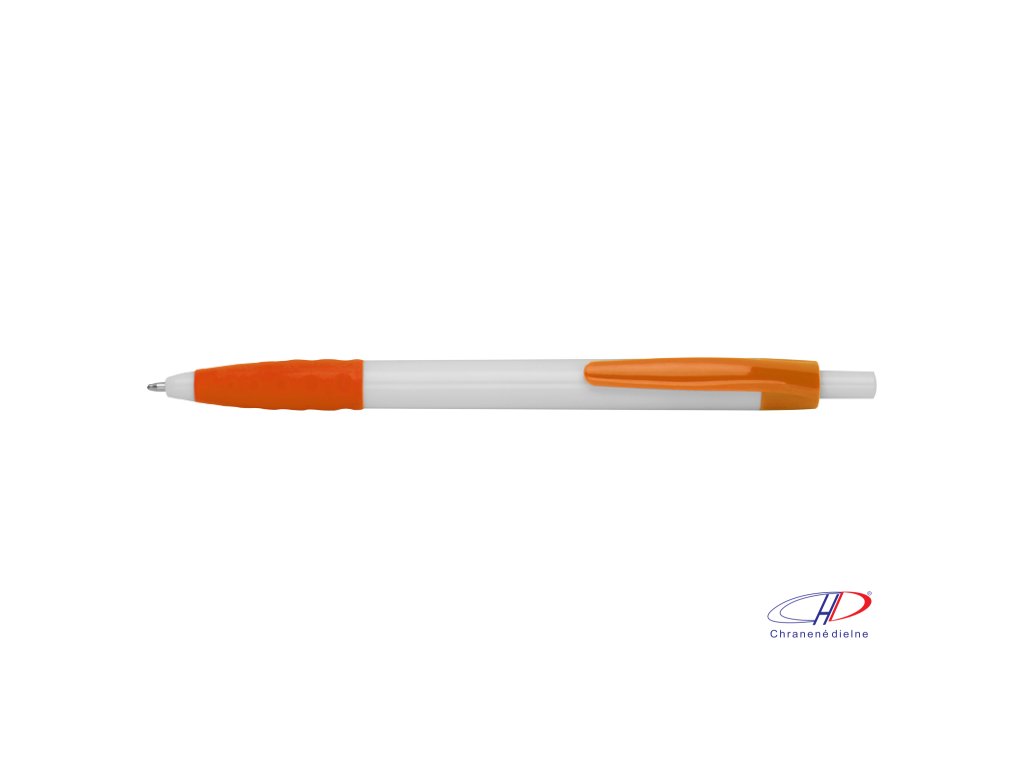 Plastové guľôčkové pero s čiernou náplňou na písanie. Biele telo, farebný klip a farebná časť na uchopenie.
