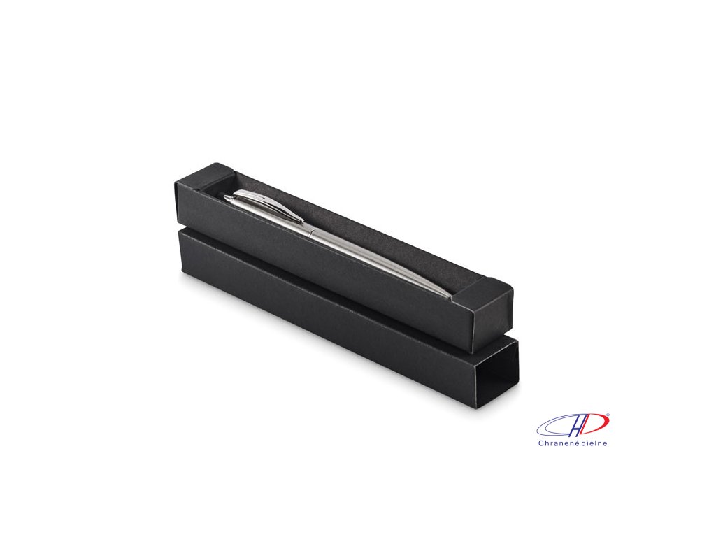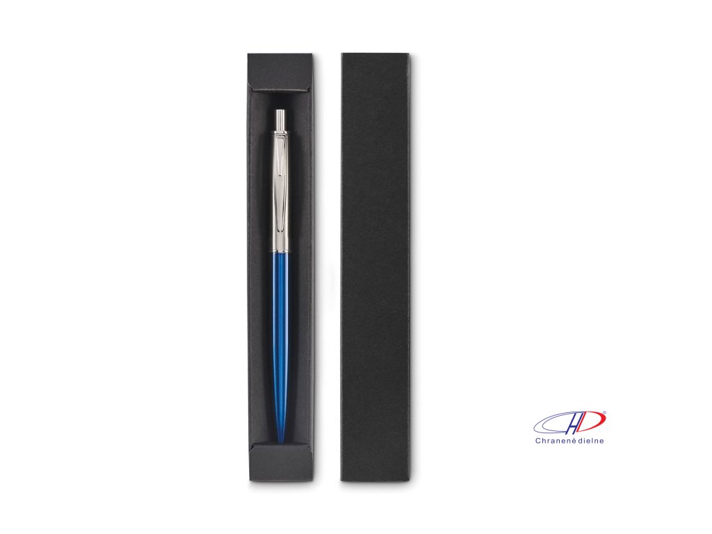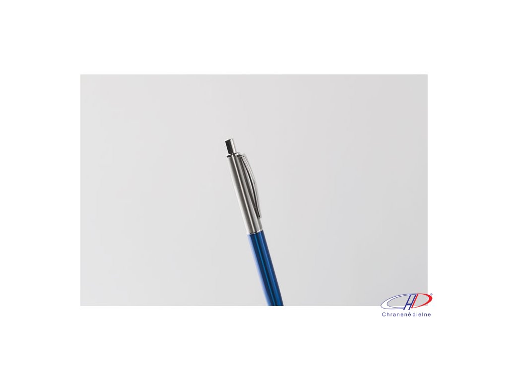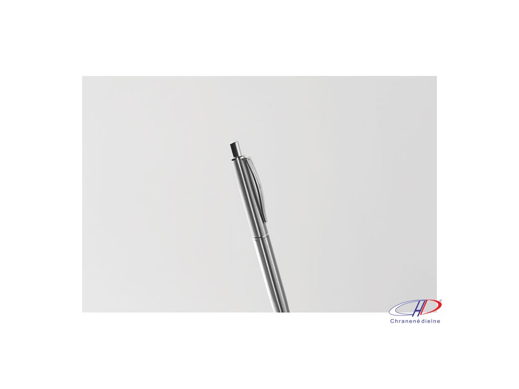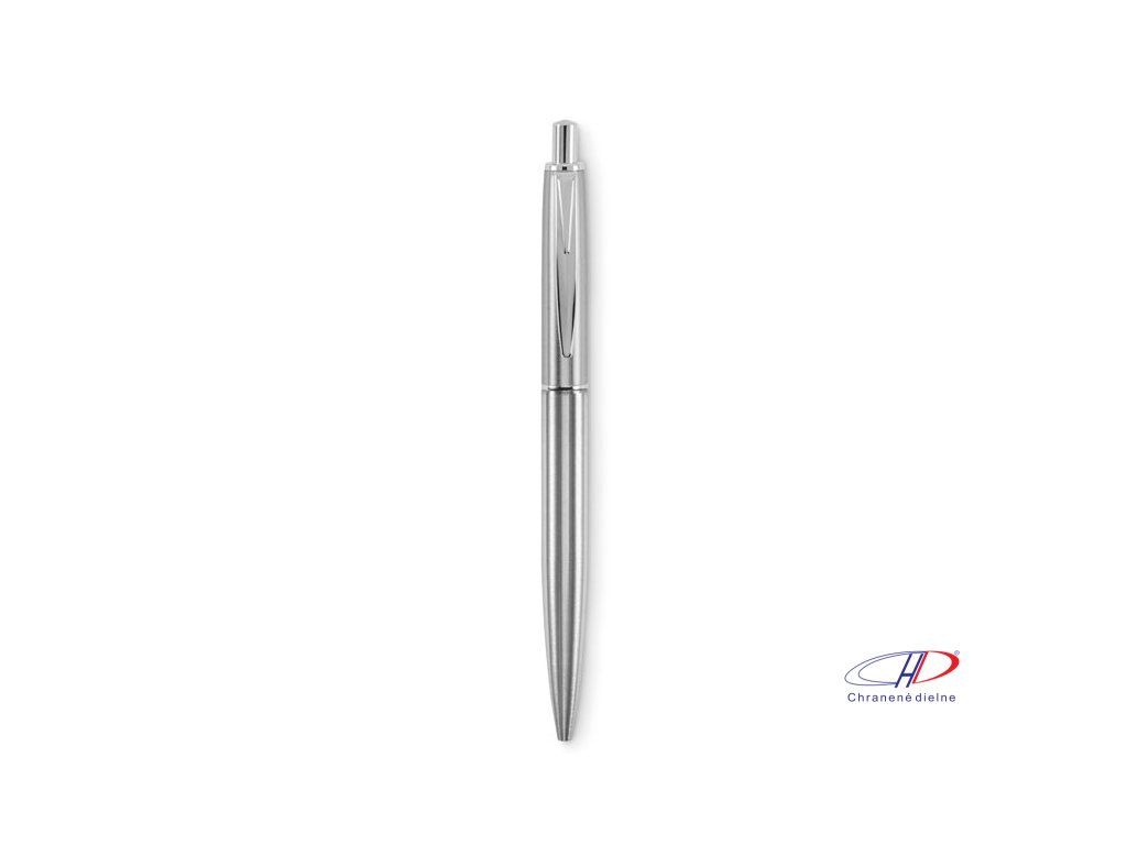 Guľôčkové pero s tlačidlovým ovládaním v recyklovanom nerezovom tele. Modrý atrament. Dodávané v darčekovej krabičke.Dodatočné parametre