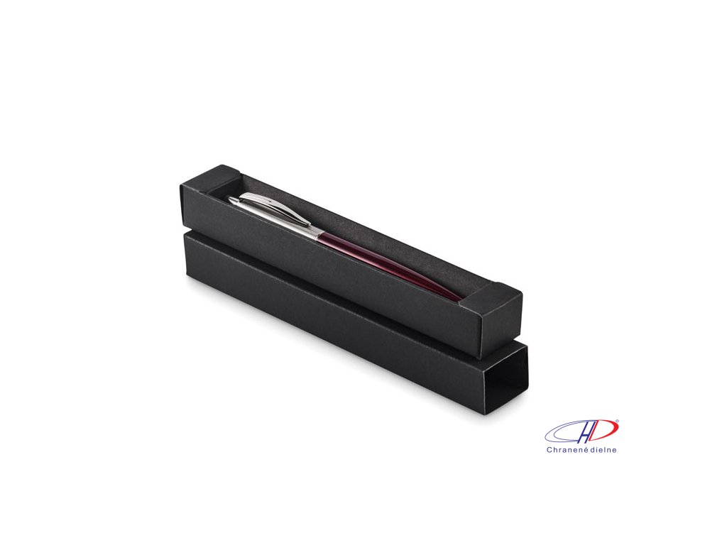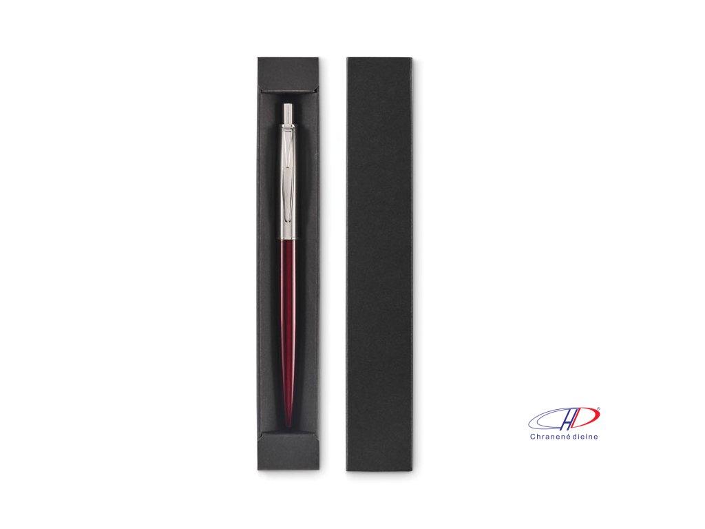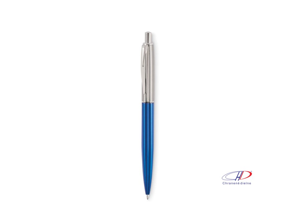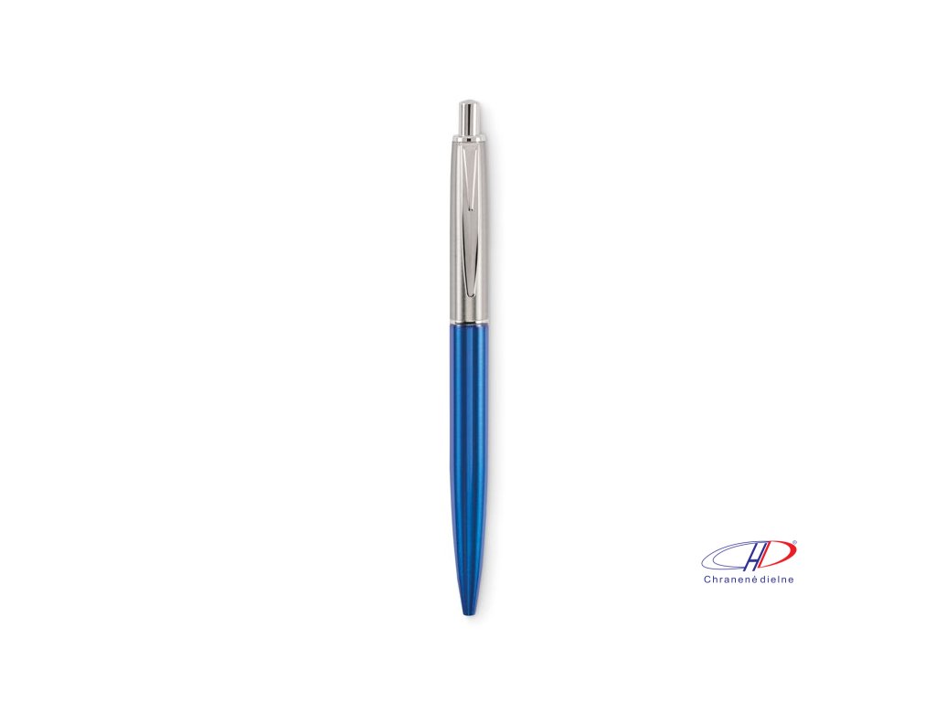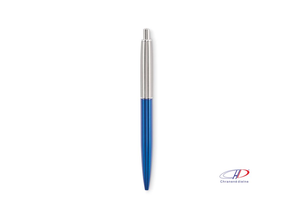 Guľôčkové pero s tlačidlovým ovládaním v recyklovanom nerezovom tele. Modrý atrament. Dodávané v darčekovej krabičke.Dodatočné parametre