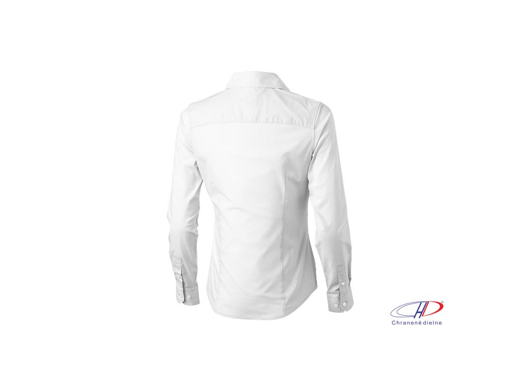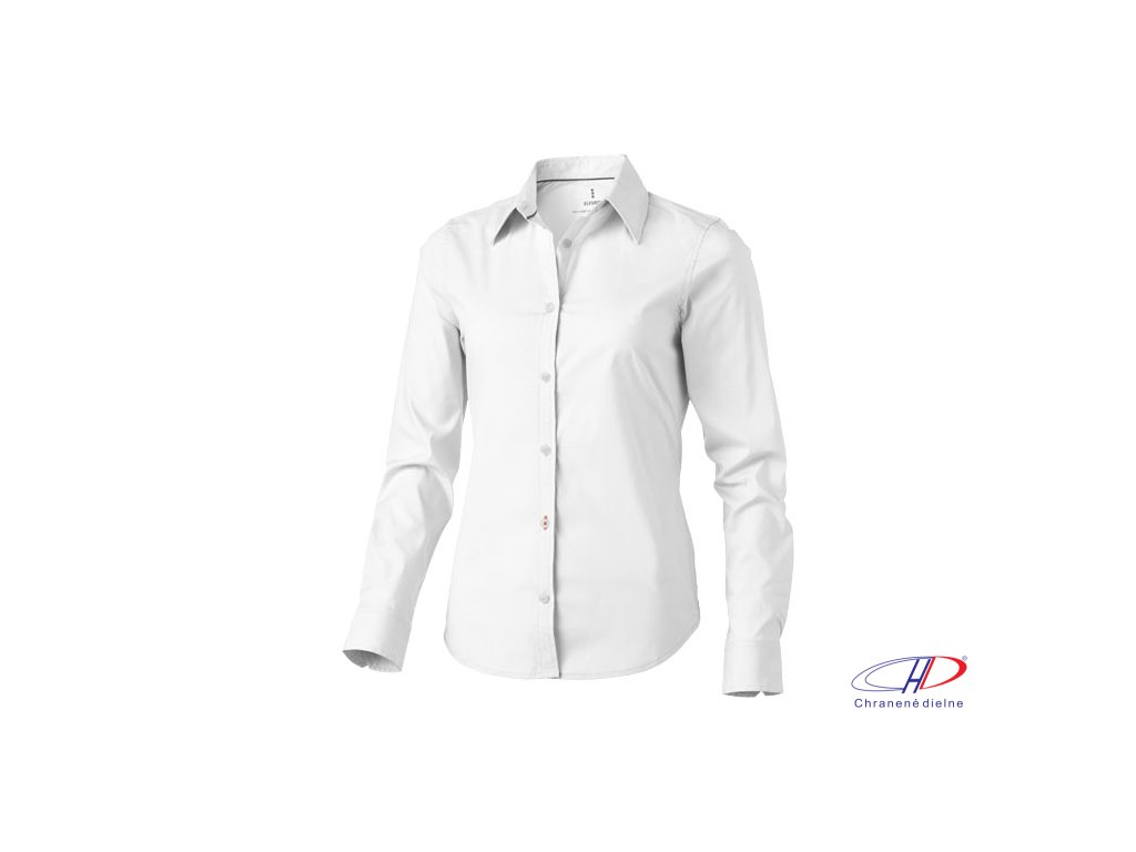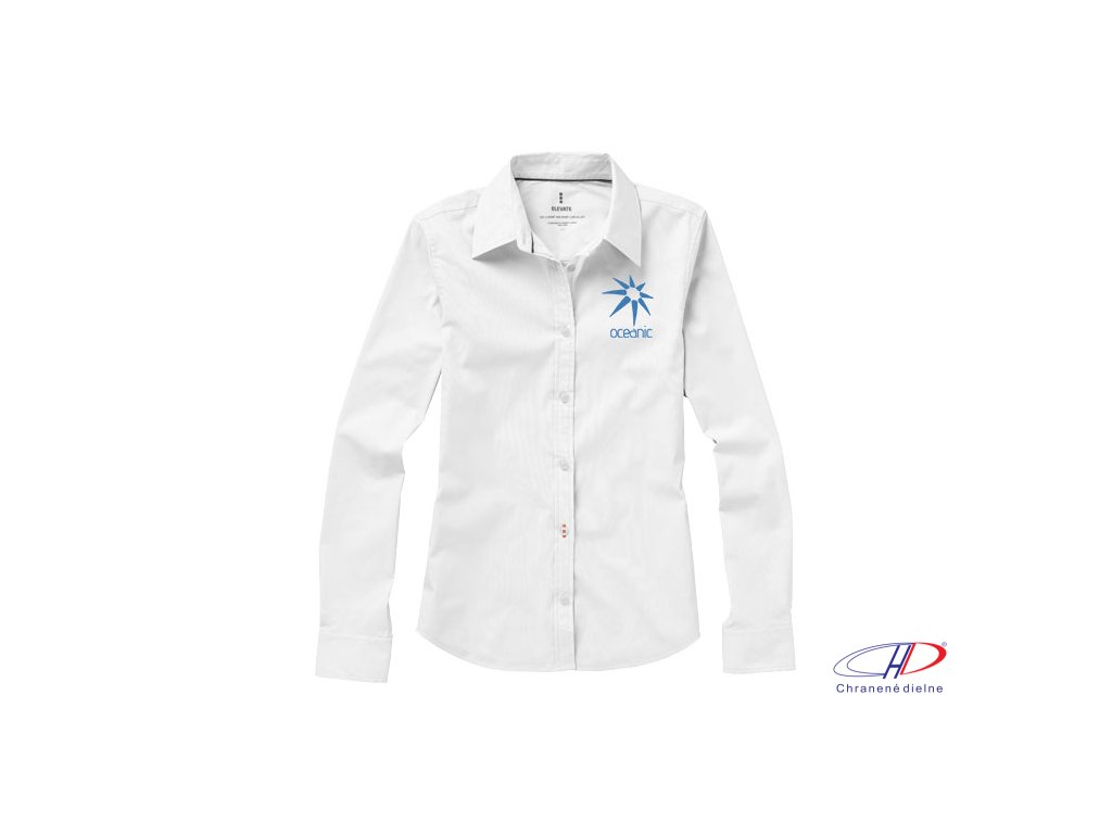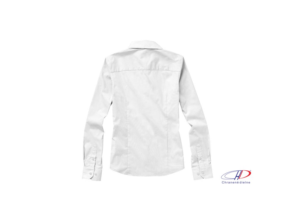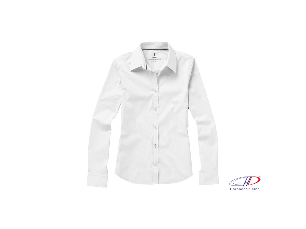 Hamilton long sleeve ladies shirt. Adjustable cuff with single pleat.Shaped seams and tapered waist for flattering fit.Satin piping at inside neck.Engraved pearl buttons.Heat transfer main label for tagless comfort. Poplin of 100% Cotton. 45x40, 142x92. 1