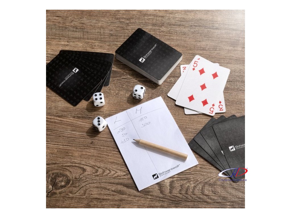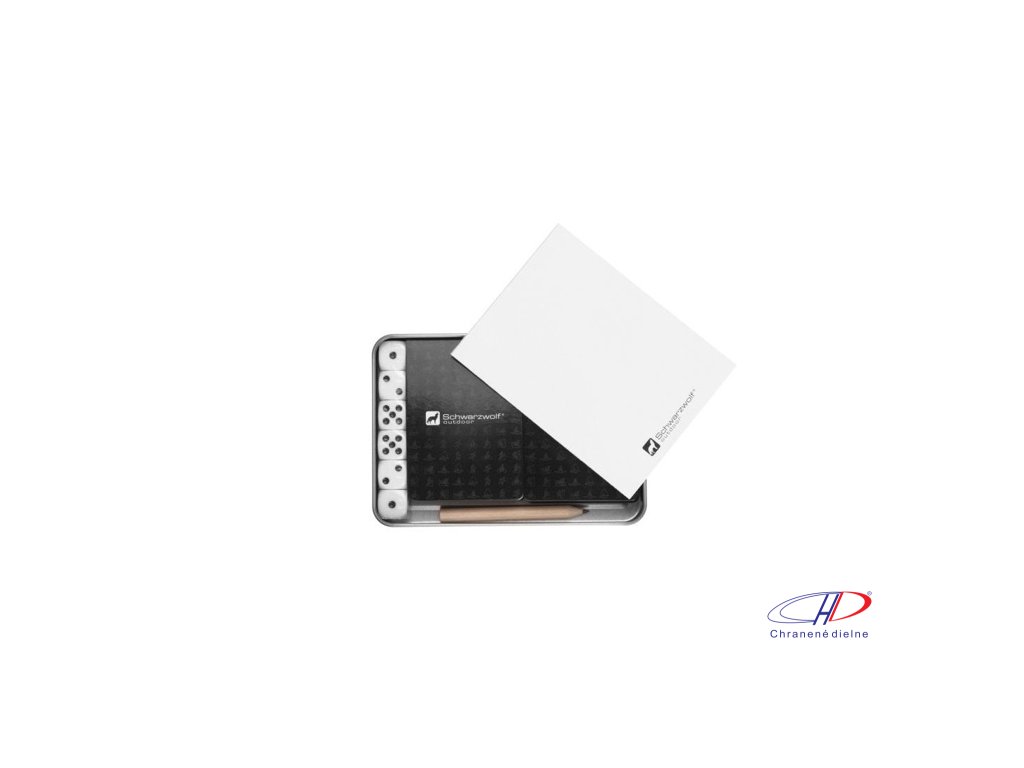 Cestovná sada hracích kariet a kociek Schwarzwolf v plechovej krabičke. Sada obsahuje 2 × 54 hracích kariet s vodeodolnou povrchovou úpravou, 6 kociek, 15 papierikov na poznámky a ceruzku. Balené v darčekovej krabičke.Dodatočné parametre