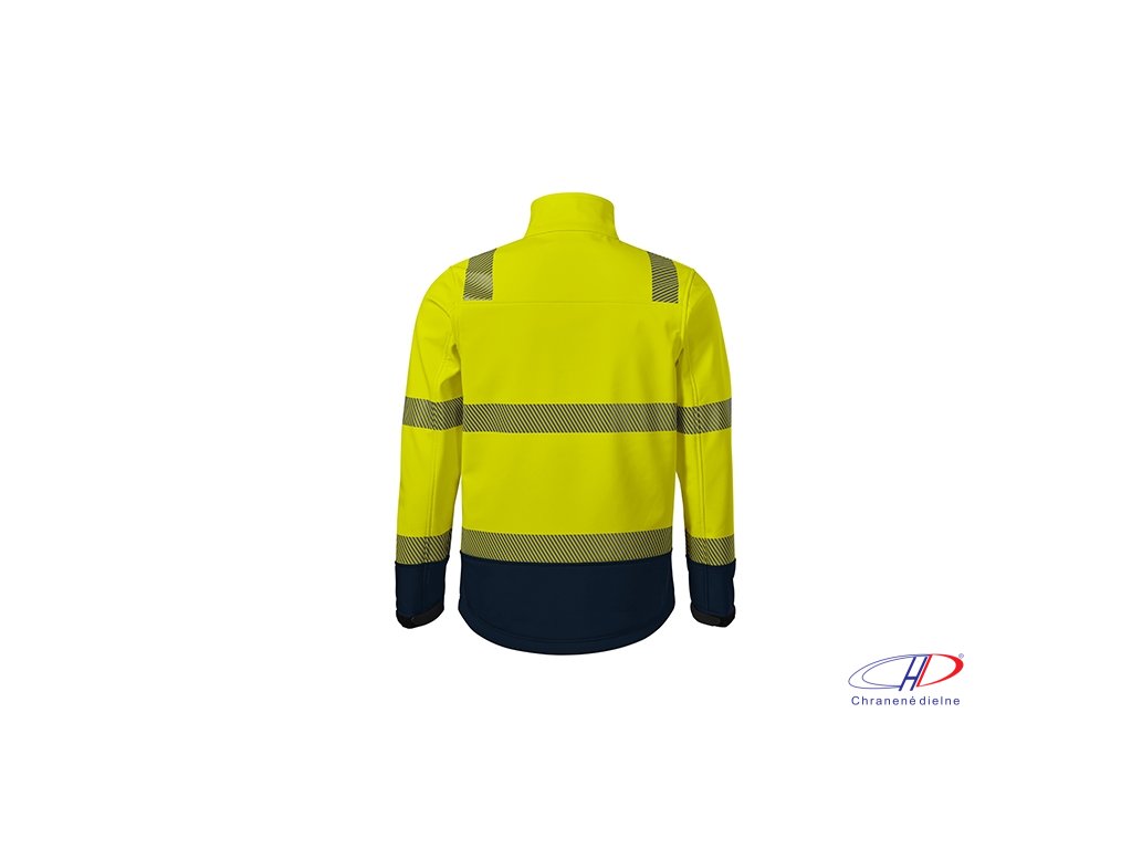 odev s vysokou viditeľnosťou v dojfarebnom prevedení, 3vrstvový softshell s membránou, vodeodolný, priedušný, fluorescenčný materiál, segmentové retroreflexné pruhy, sedlo na zadnom diele, celozapínací reverzný špirálový zips s krytkou brady, lemy rukávov nastaviteľné suchým zipsom, lištové vrecká s reverzným špirálovým zipsom, náprsné vrecko, vnútorné náprsné vrecko na zips so vstupom pre branding, tvarovaný a mierne predĺžený zadný diel, dolný lem na stiahnutie elastickou šnúrkou, pútko na zavesenie, vnútorný fleece s antipilingovou úpravou, certifikácia podľa noriem EN ISO 20471/A1 (trieda 2 - M, L; trieda 3 - XL - 4XL) a EN ISO 13 688Dodatočné parametre