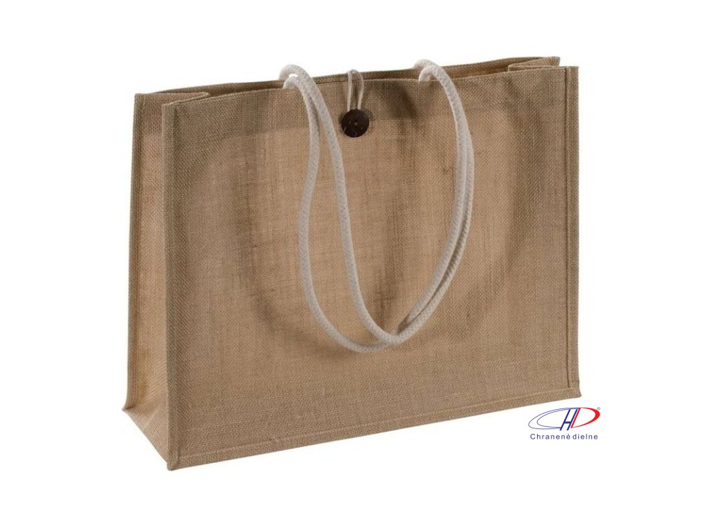 Nákupná taška z juty s rúčkou v prirodzenej farbe na zapínanie gombíkom.