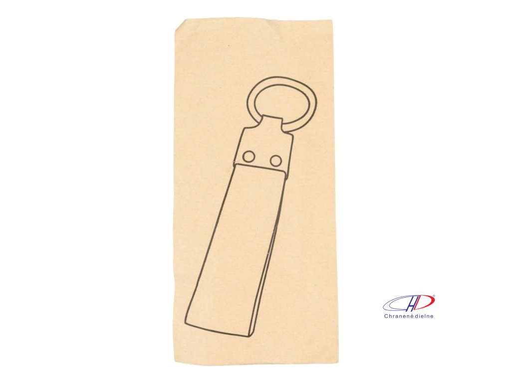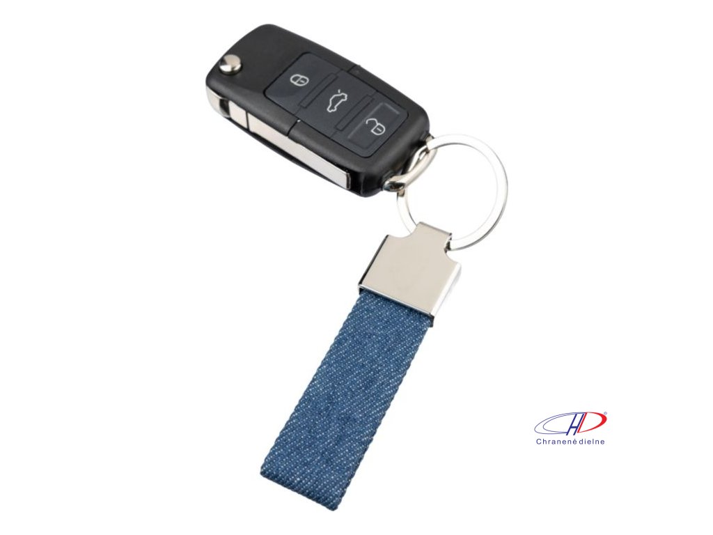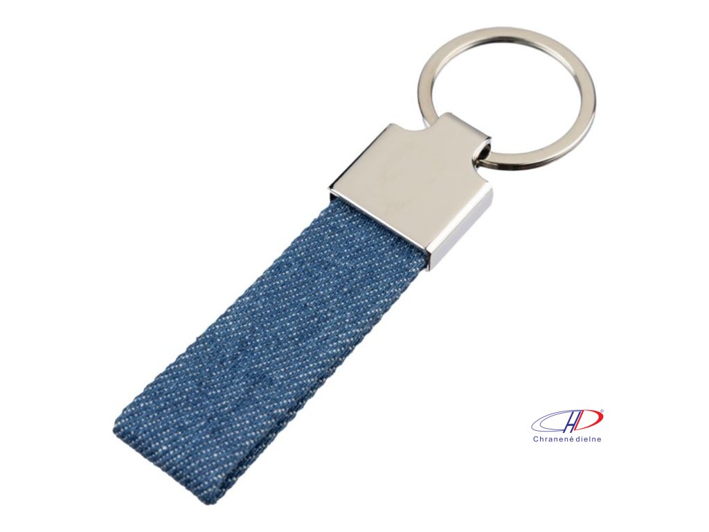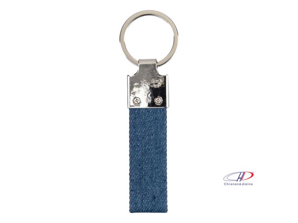 Kľúčenka z džínsoviny a zliatiny zinku s pevným kovovým krúžkom. Jednotlivo balená v obale z kraftového papiera.Dodatočné parametre