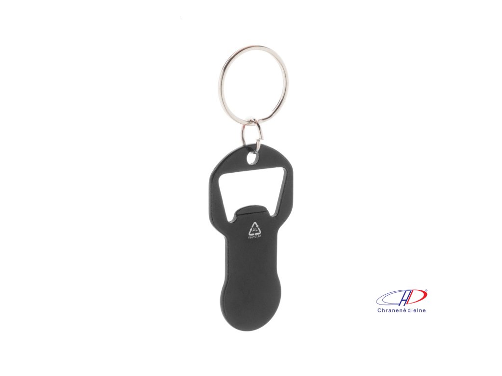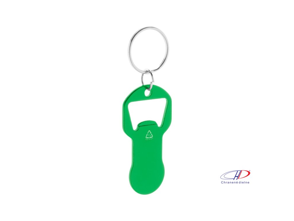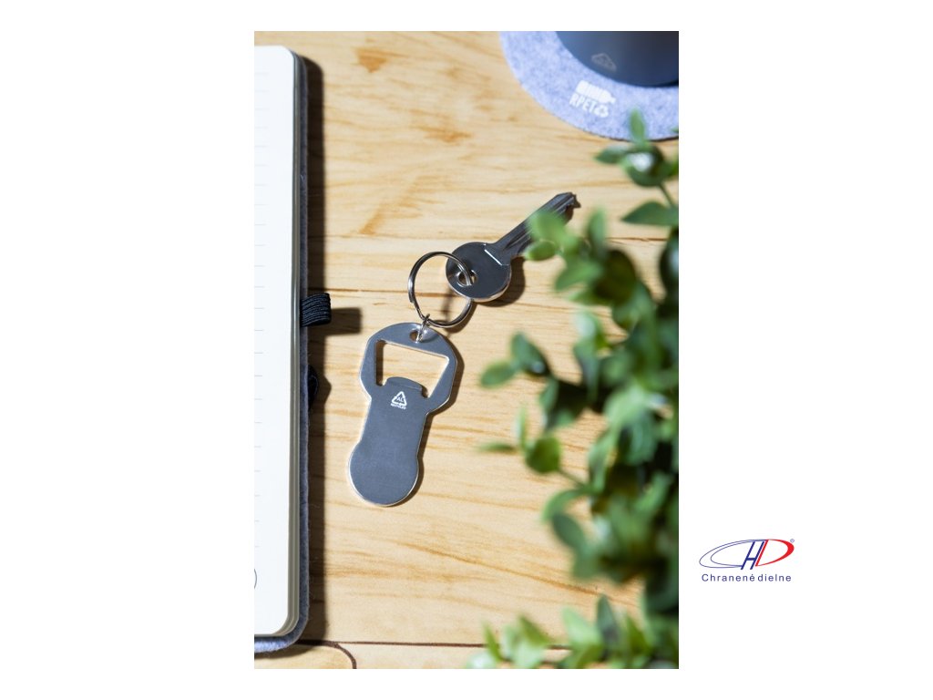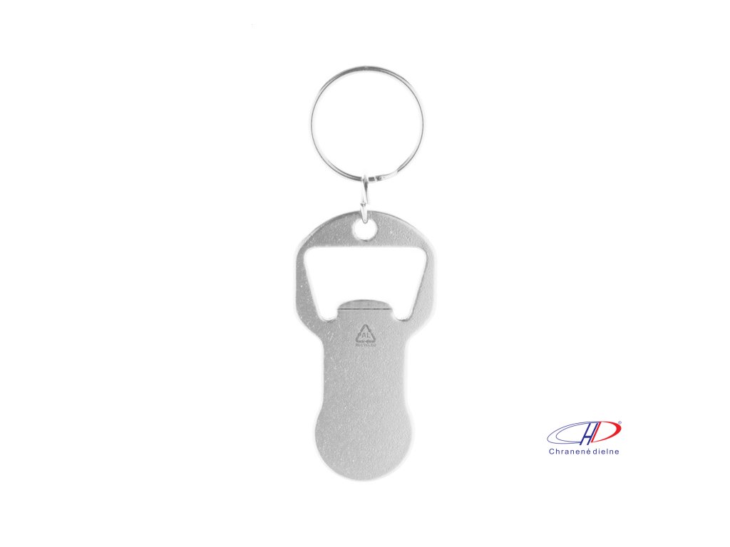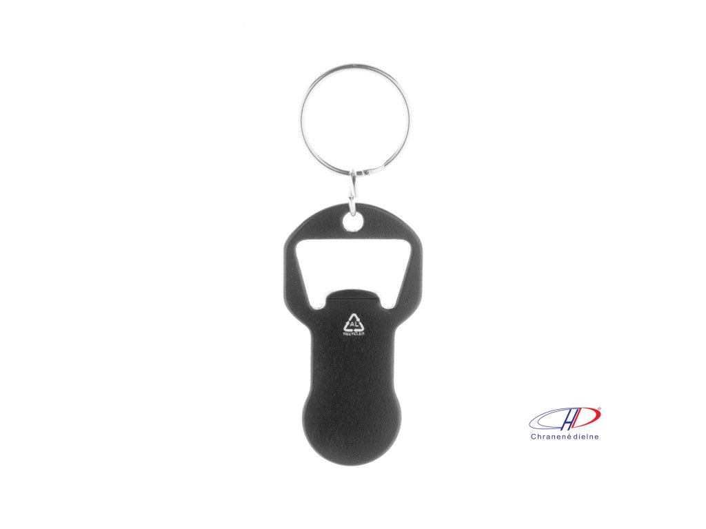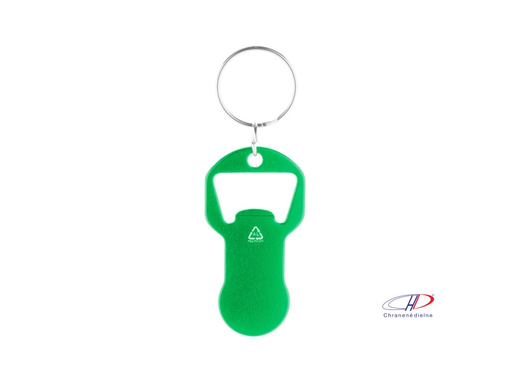 Prívesok na kľúče s otváračom na fľaše z recyklovaného hliníka so žetónom do nákupného vozíka.Dodatočné parametre