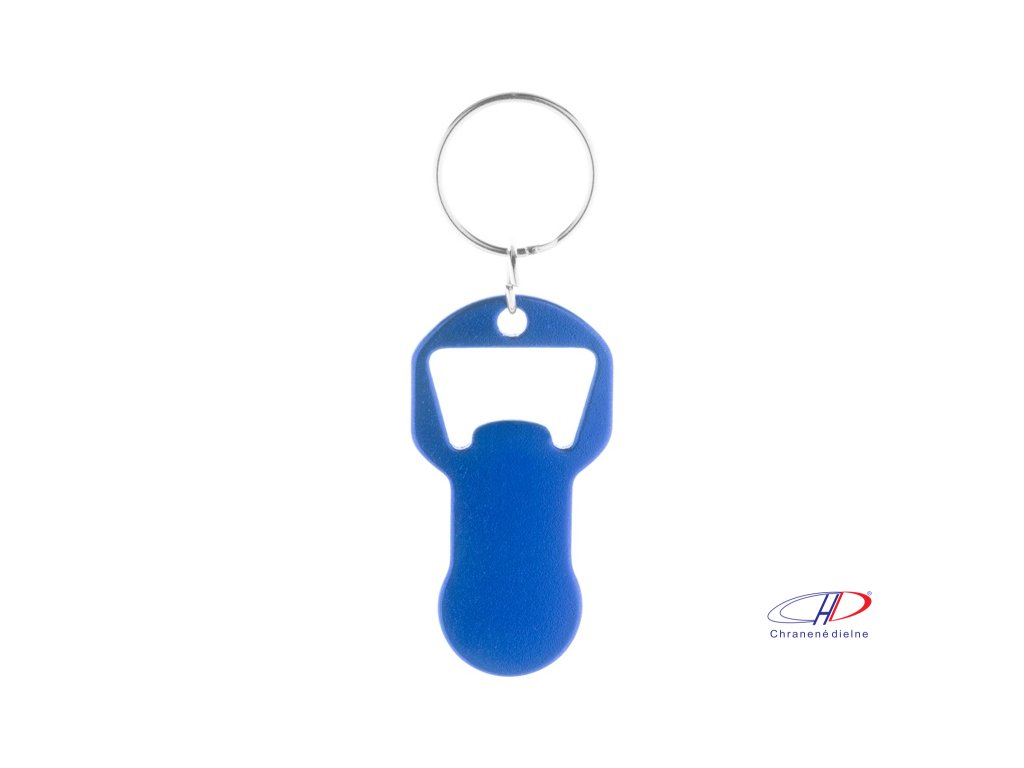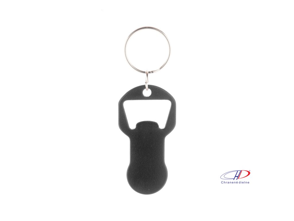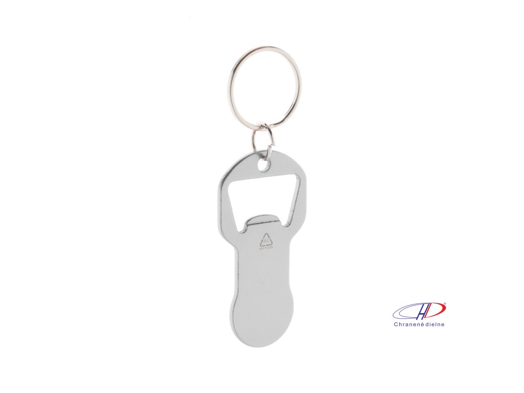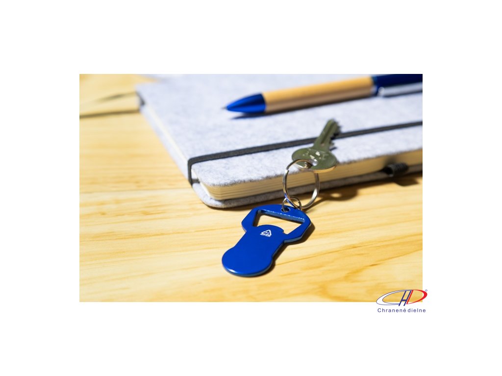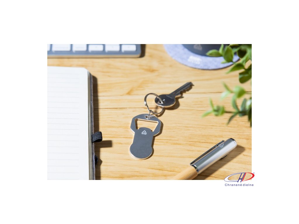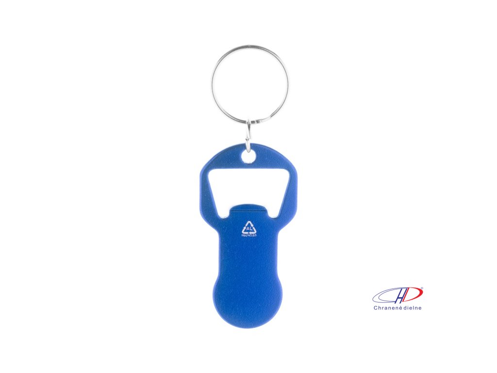 Prívesok na kľúče s otváračom na fľaše z recyklovaného hliníka so žetónom do nákupného vozíka.Dodatočné parametre