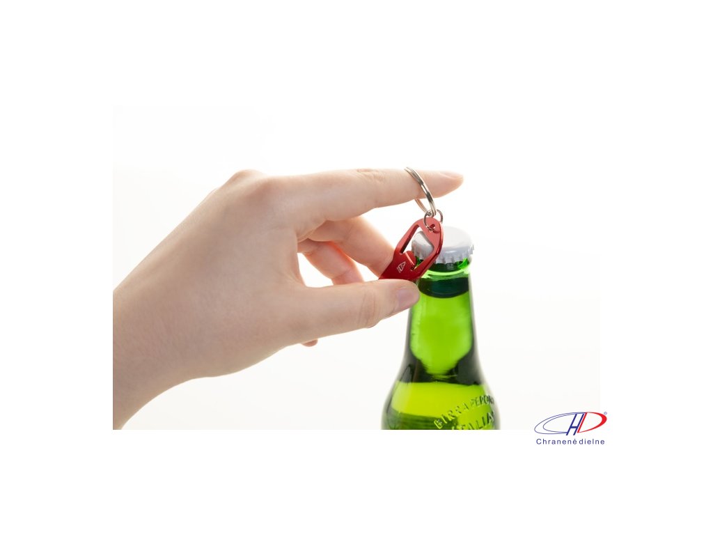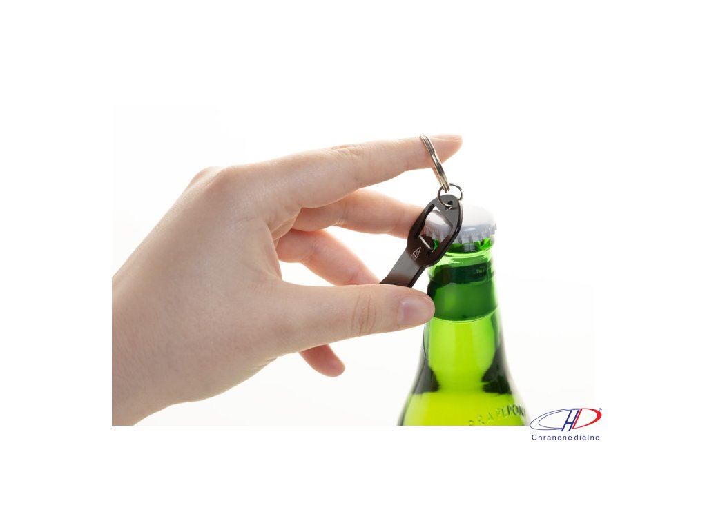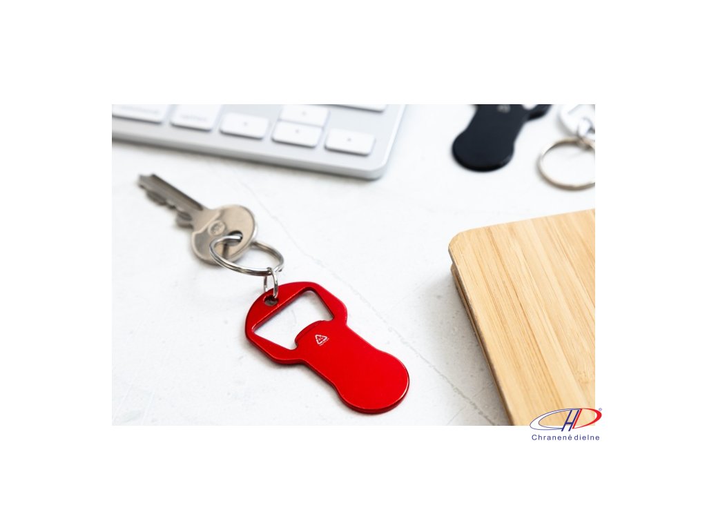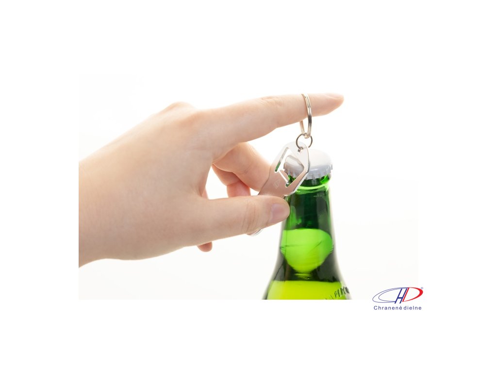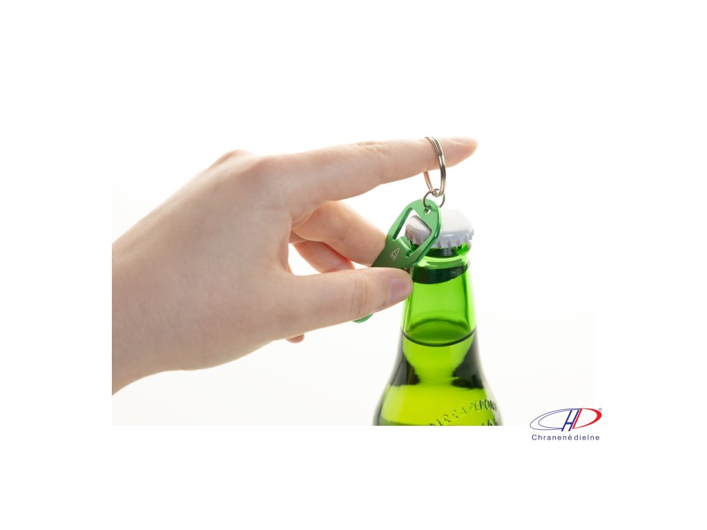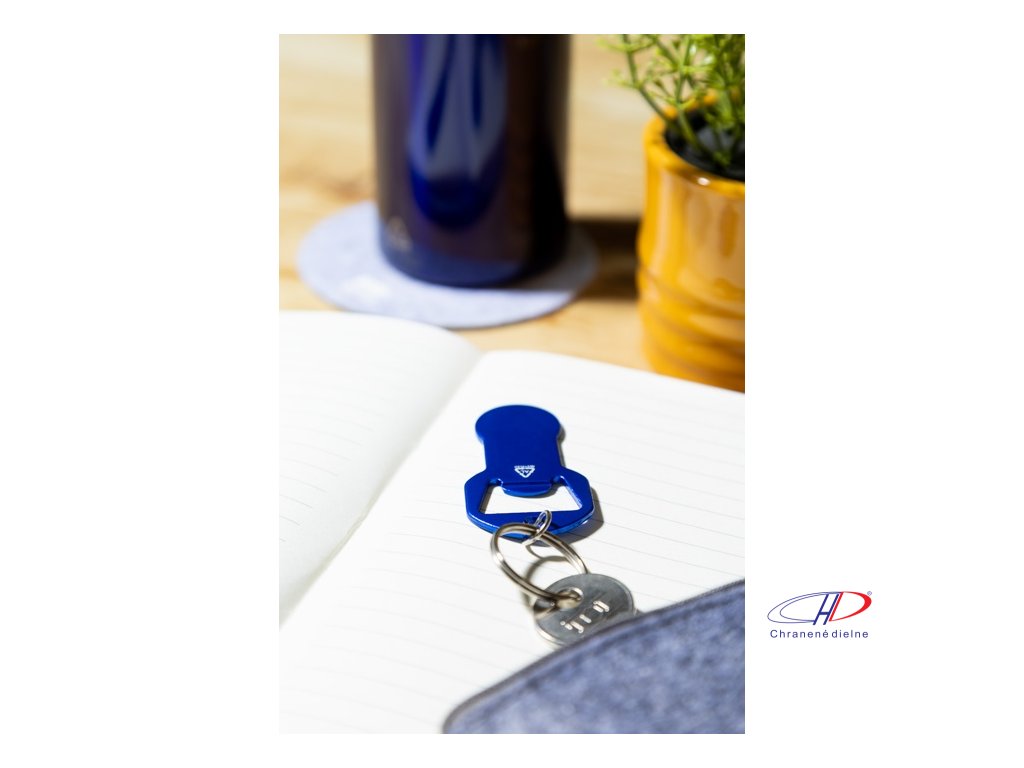 Prívesok na kľúče s otváračom na fľaše z recyklovaného hliníka so žetónom do nákupného vozíka.Dodatočné parametre