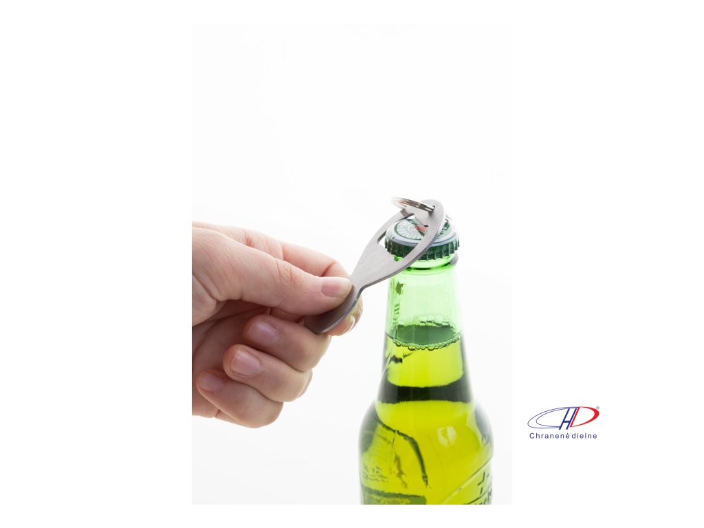 Prívesok na kľúče z recyklovanej nerezovej ocele s otváračom na fľaše a žetónom do nákupného vozíka.Dodatočné parametre