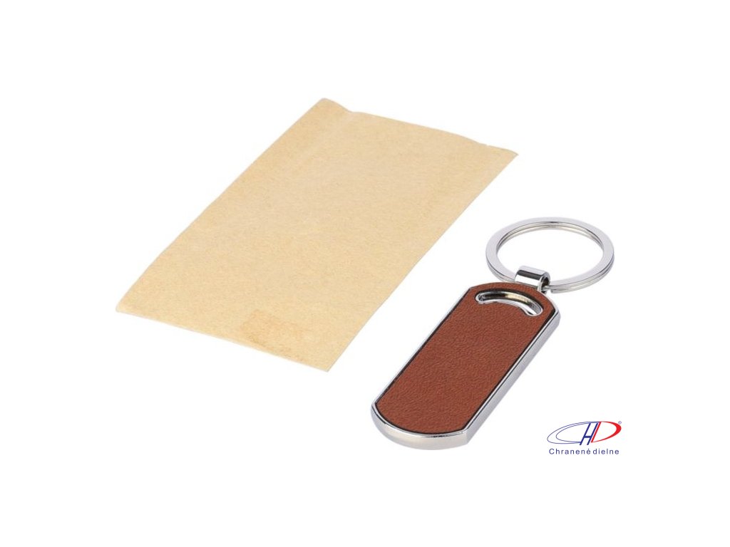 Kľúčenka z recyklovanej kože s kovovým krúžkom. Na boku obsahuje embosované logo recyklovanej kože. Jednotlivo balené v hnedom kartónovom obale.Dodatočné parametre