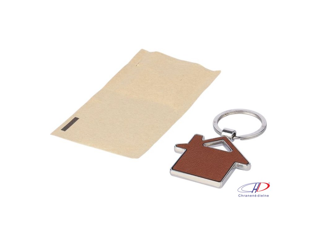 Kľúčenka z recyklovanej kože s kovovým krúžkom. Na boku obsahuje embosované logo recyklovanej kože. Jednotlivo balené v hnedom kartónovom obale.Dodatočné parametre