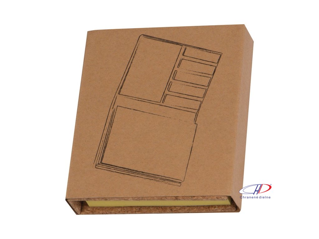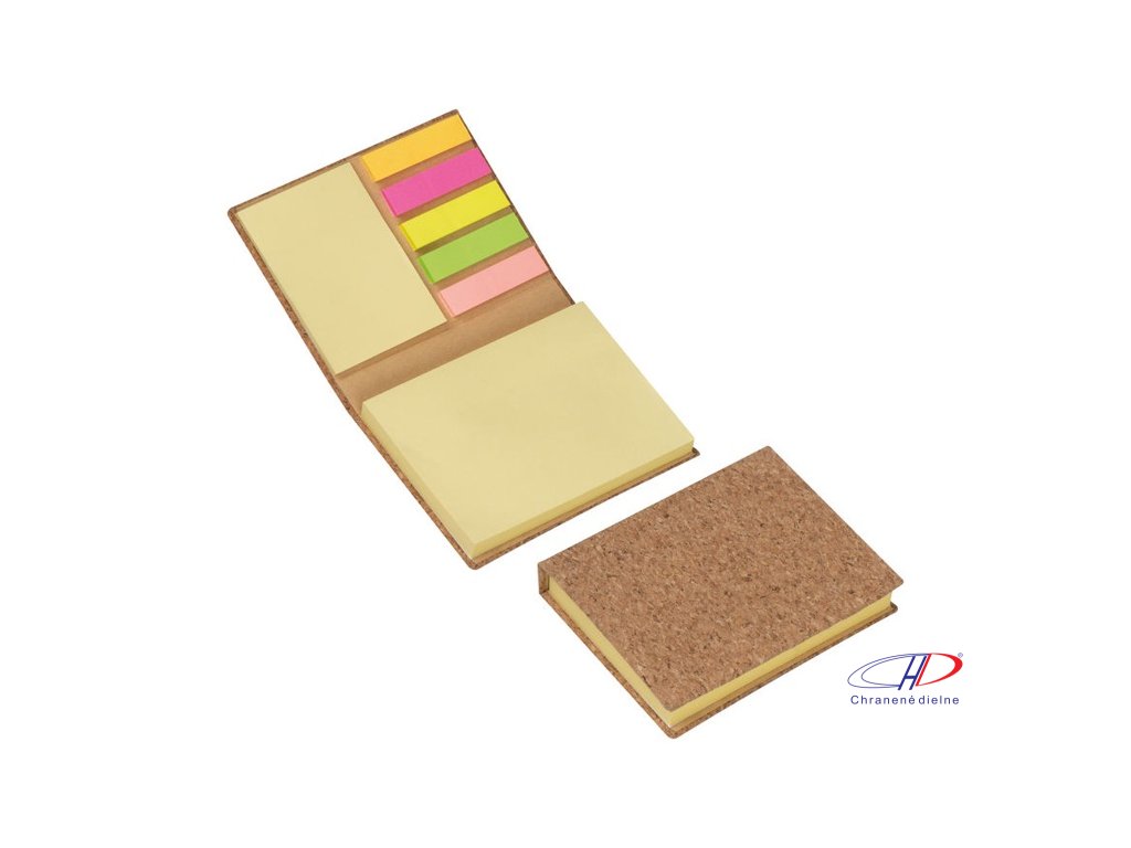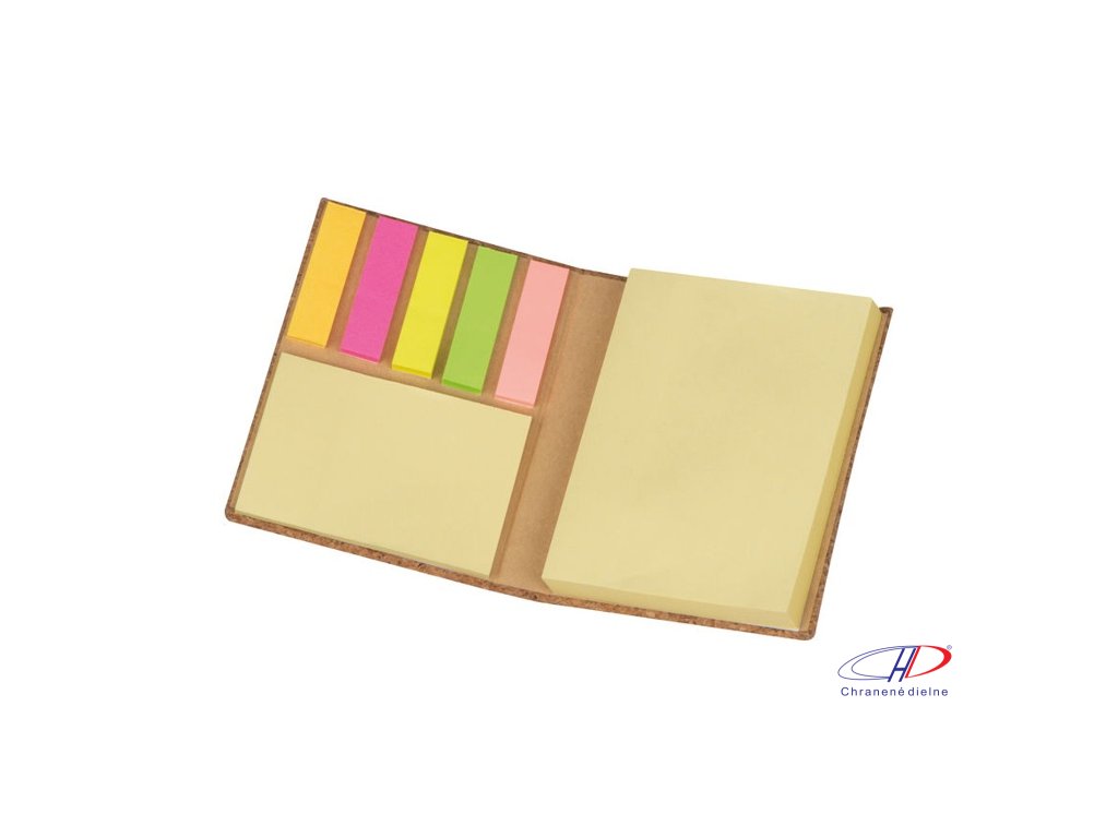 Poznámkový blok s rôznymi farebnými samolepiacimi pásikmi a s obalom z korku.