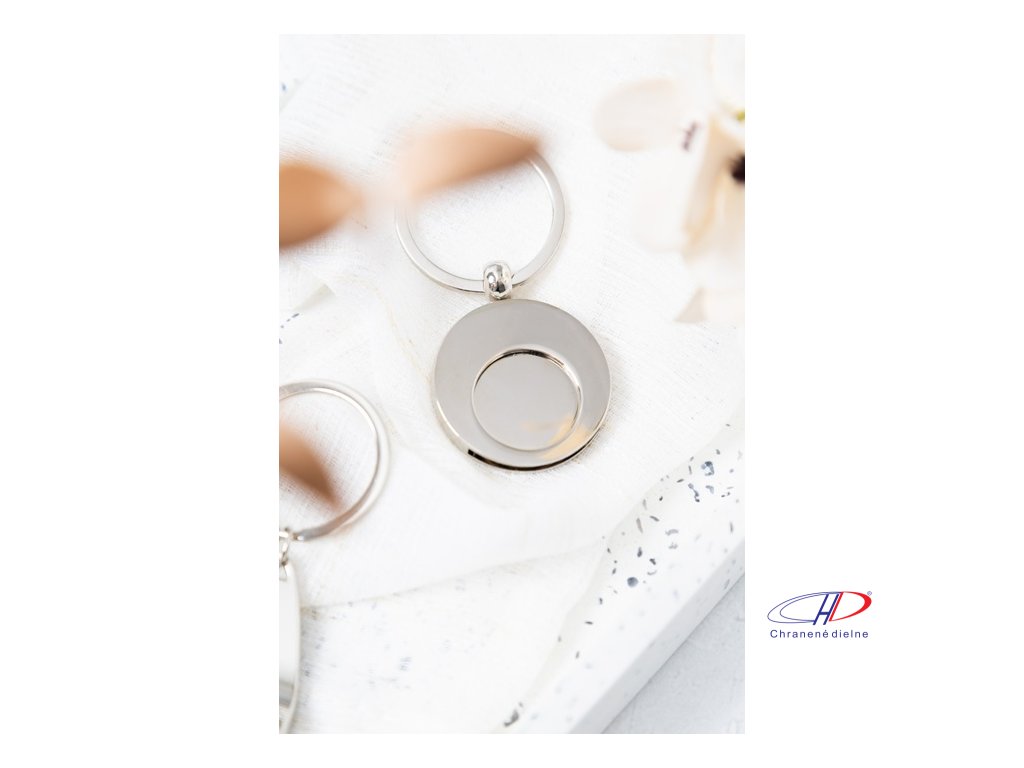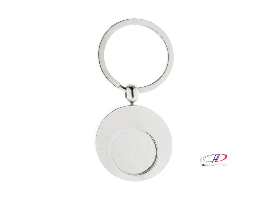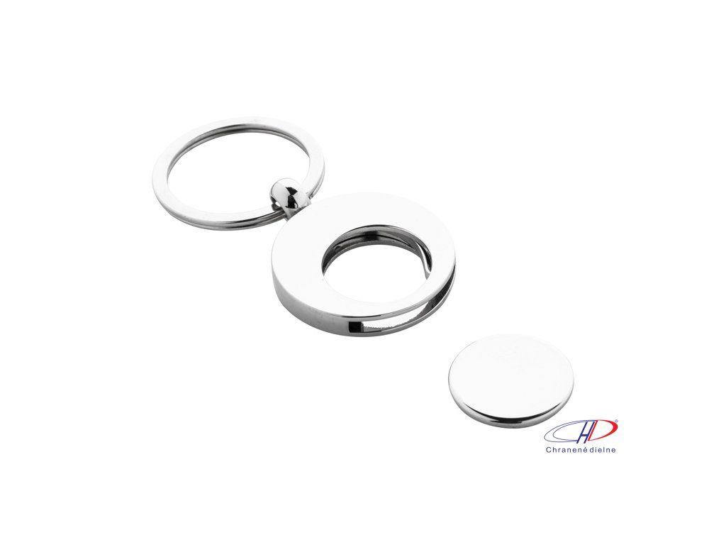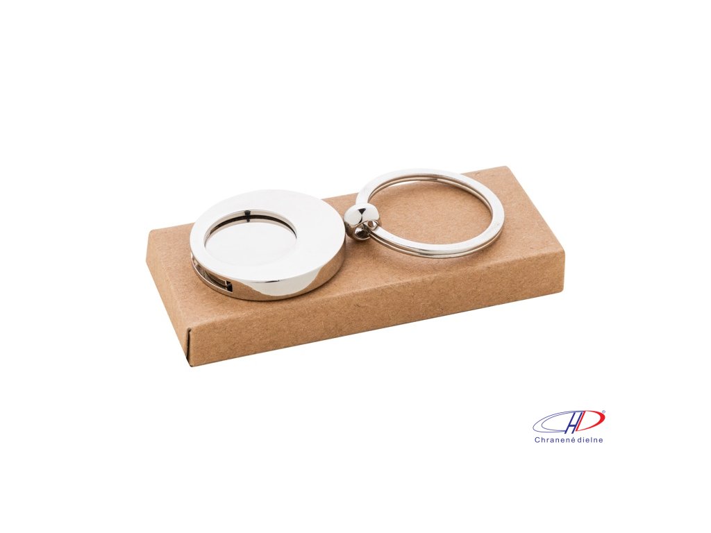 Okrúhly kovový prívesok na kľúče so žetónom do nákupného vozíka. V kraftovej papierovej krabičke.Dodatočné parametre