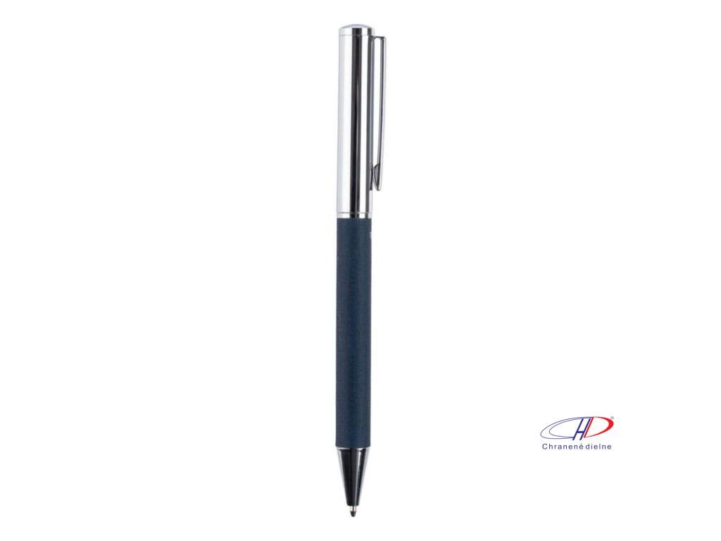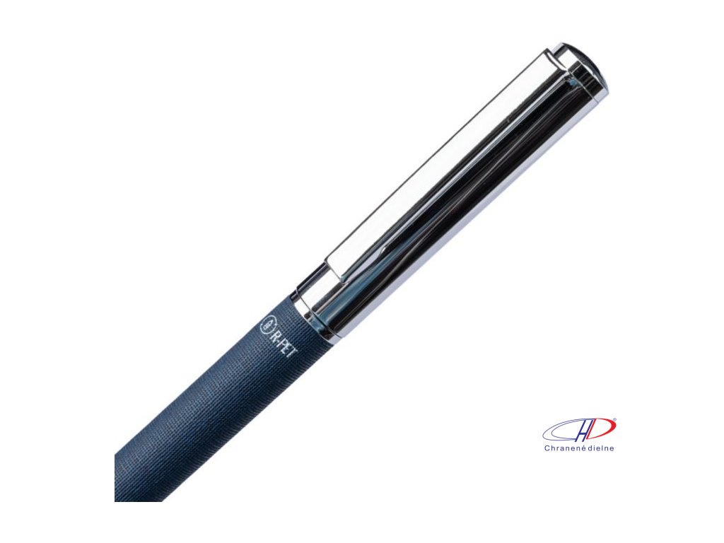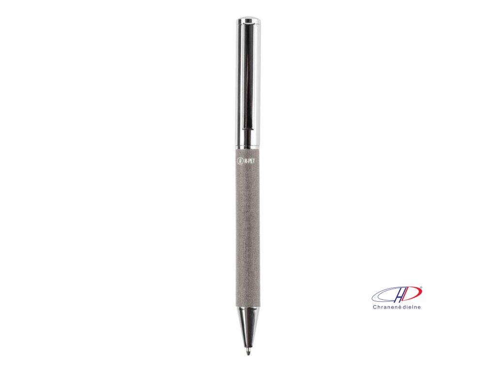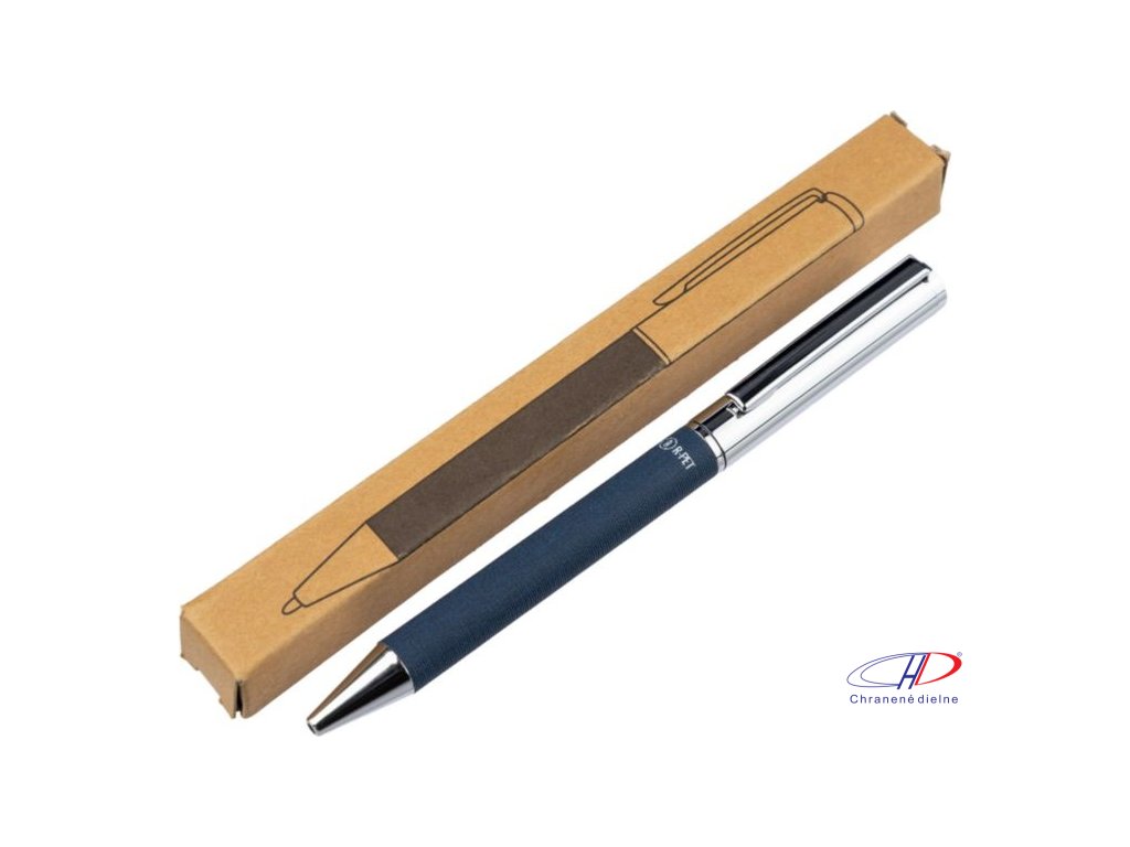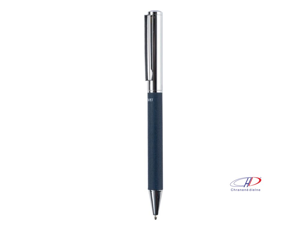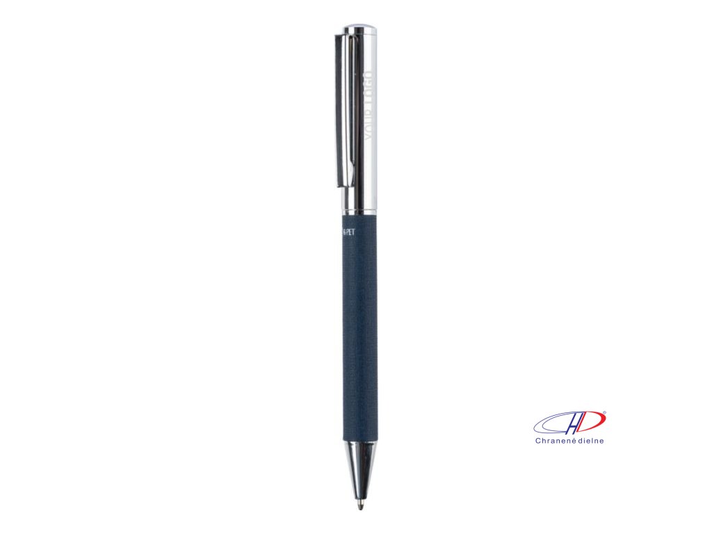 Otočné guľôčkové pero z mosadze a rPET s kovovým klipom a úchopom. Má otočný mechanizmus a logo rPET na tele. Jednotlivo balené v hnedej kartónovej škatuli. Modrá náplň.Dodatočné parametre