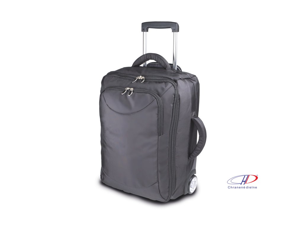 Veľký kufrík na kolieskach zo 600D polyesteru. Veľká hlavná priehradka. Predné vrecko. Pútka zipsu v rovnakej farbe. Bočné nožičky. Polstrované a vystužené rukoväte. Vnútorné priehradky podšité čiernym polyesterom so šnúrkami.Dodatočné parametre