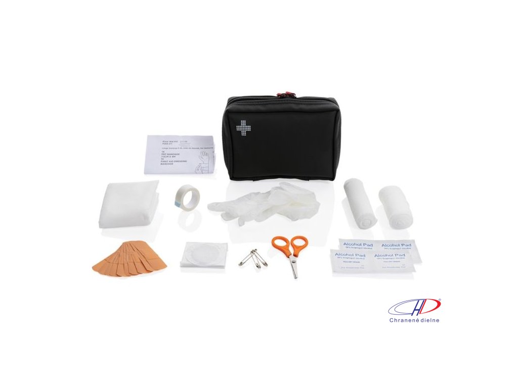 Obsah: 1ks PBT obväz, 1ks PBT a kompresný obväz, 1 trojuholníkový obväz, 1ks sada na CPR, 1 lepiaca páska, 3 špendlíky, 1 nožnice, 10 náplastí a 4ks alkoholových vankúšikov. V súlade s 93/42/EHS a EÚ (2017/745), EN ISO 13485:2016. Podiel recyklátu: 24 %.Dodatočné parametre