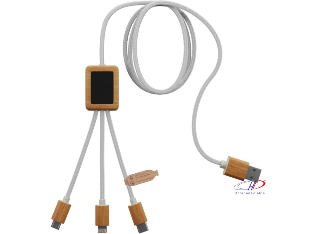 Nabíjací kábel 3v1 so svietiacim logom a hranatým puzdrom z bambusu. Svietiace logo viditeľné na oboch stranách. 3 konektory (typ C, micro USB, iPhone) a duálny USB konektor. Dodáva sa v bavlnenom sáčku. Dĺžka: 1 m. Záruka 3 roky.Dodatočné parametre
