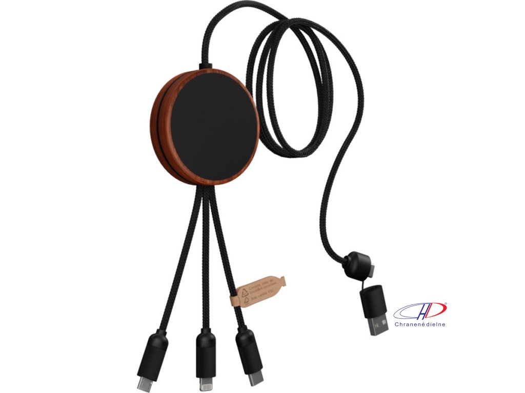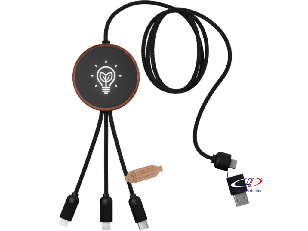 Nabíjací kábel 5v1 so svietiacim logom a 10W bambusovou nabíjacou podložkou. Má 3 konektory (typ C, micro USB, iPhone) a duálny USB konektor pre univerzálne použitie. Dodáva sa v sáčku z TPU s kartičkou z kraftového papiera. Dĺžka: 1 meter. Záruka 3 roky.Dodatočné parametre