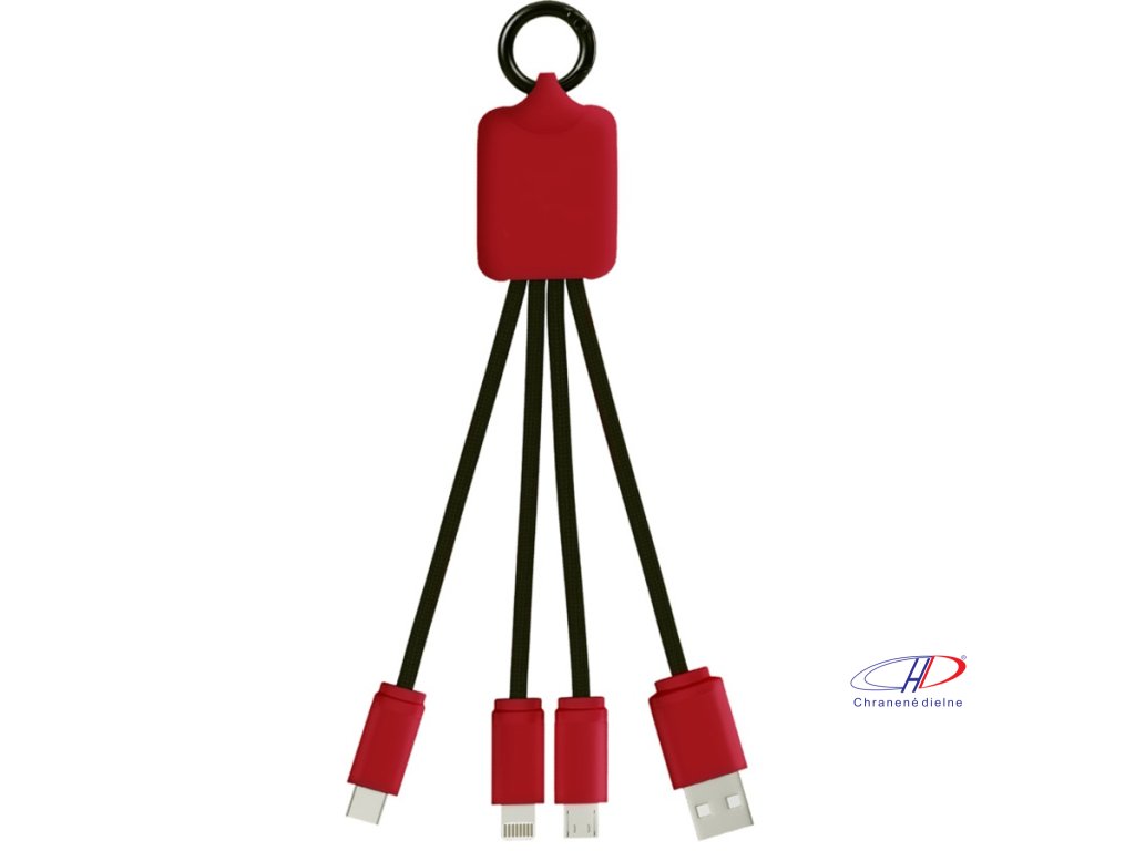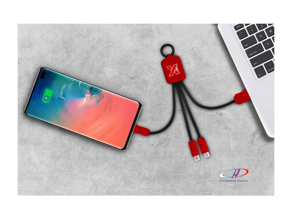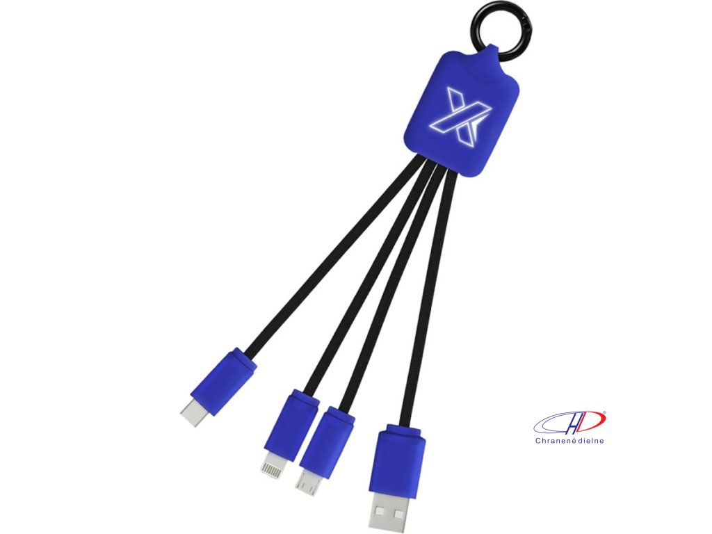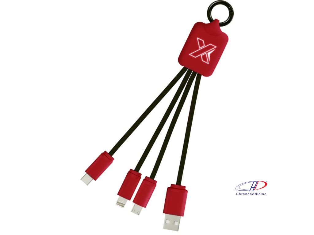 Nabíjací kábel so svetelným logom, gumeným povrchom, kovovými doplnkami a 3 výstupnými konektormi (USB-C, Android, iPhone). Možné nabíjať až 3 zariadenia súčasne. Dĺžka káblu (vrátane zástrčiek): 10 cm.Dodatočné parametre