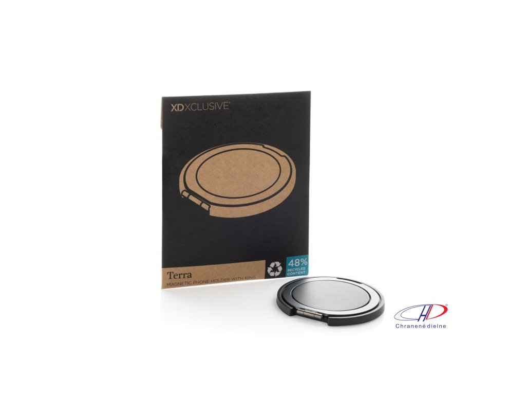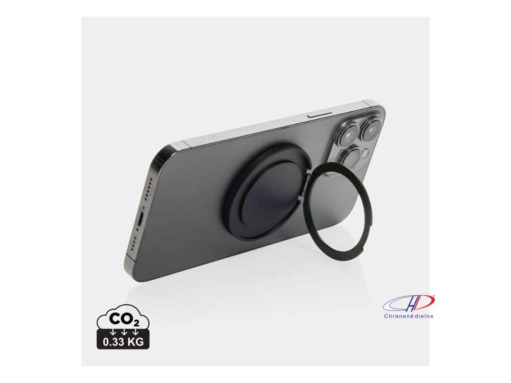 Magnetický držiak telefónu s extra silným magnetom. Kompatibilné so všetkými telefónmi, ktoré sú vybavené integrovaným magnetom. Hliníkový krúžok je možné odklopiť, aby sa z telefónu stal stojan. Podiel recyklátu: 48 %. RCS certifikácia.Dodatočné parametre