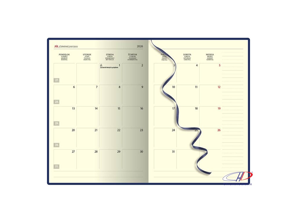 Zaujímavý dizajn týždenného diára tvorí kombinácia 2 farieb poťahového materiálu. Diár je v pevnej väzbe s prednou penovou doskou, kovovou nálepkou roku, farebnou lacetkou, ozdobným kontrastným prešitím. Kalendárium: SK/CZ-UK-DE-RU. Rozsah: 160 listov.Dodatočné parametre