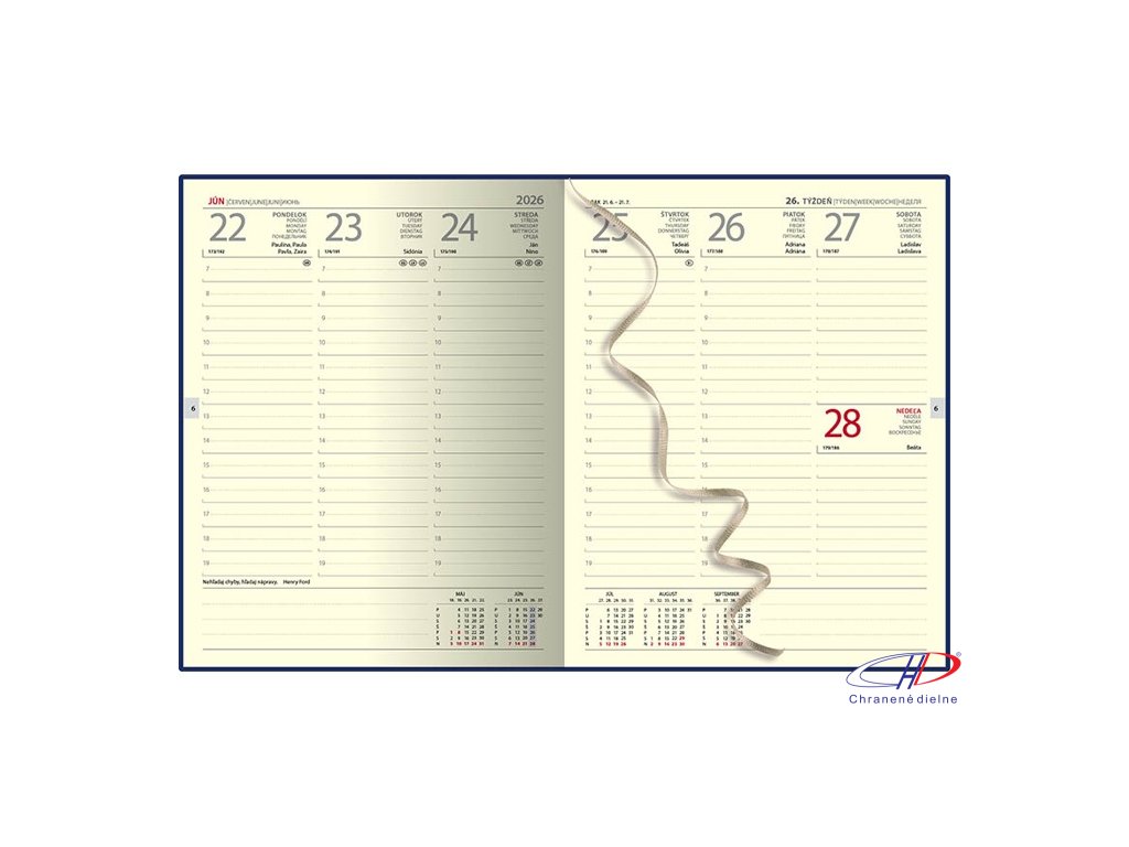 Luxusný manažérsky týždenný diár z ekologickej kože s prehľadným kalendáriom na celý týždeň. Pevná väzba s prednou aj zadnou penovou doskou, ozdobné prešitie po obvode, strieborný pliešok s rokom a 2 lacetkami. Kalendárium: SK/CZ-UK-DE-RU.Dodatočné parametre