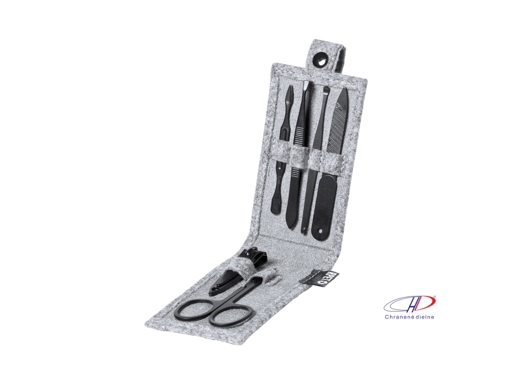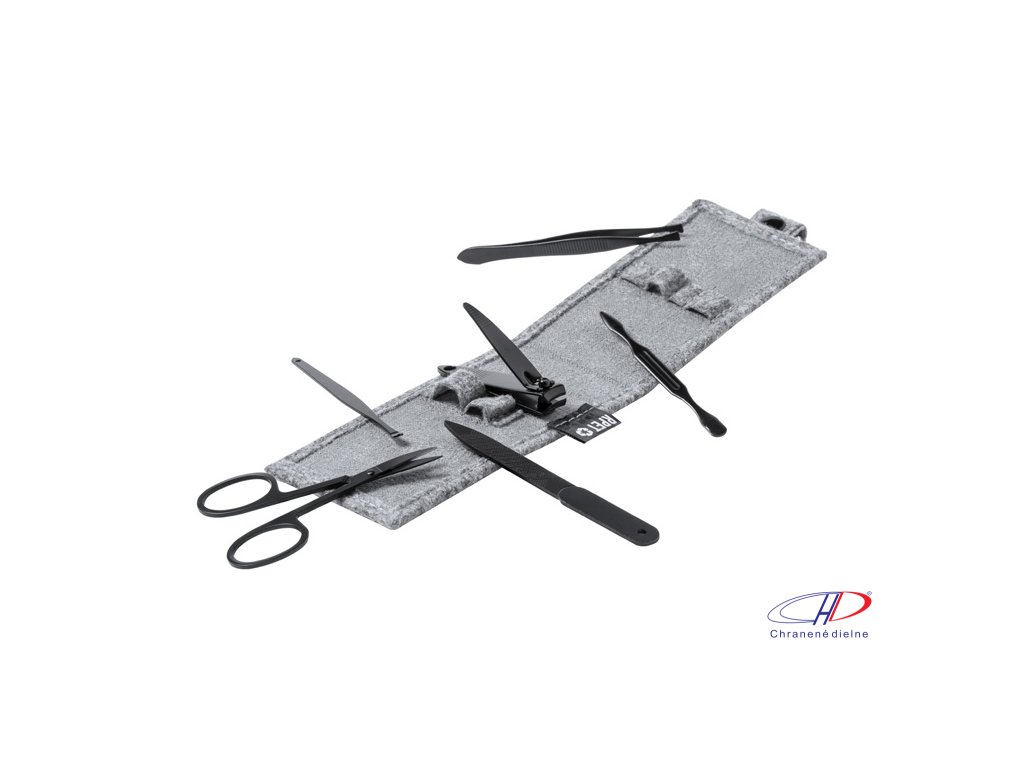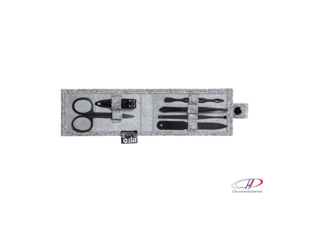 6 dielna manikúra z nerezovej ocele v plstennom puzdre RPET. Obsahuje nožnice, nožnice na nechty, pilník na nechty, pinzetu a 2 odstraňovače kožičky.Dodatočné parametre