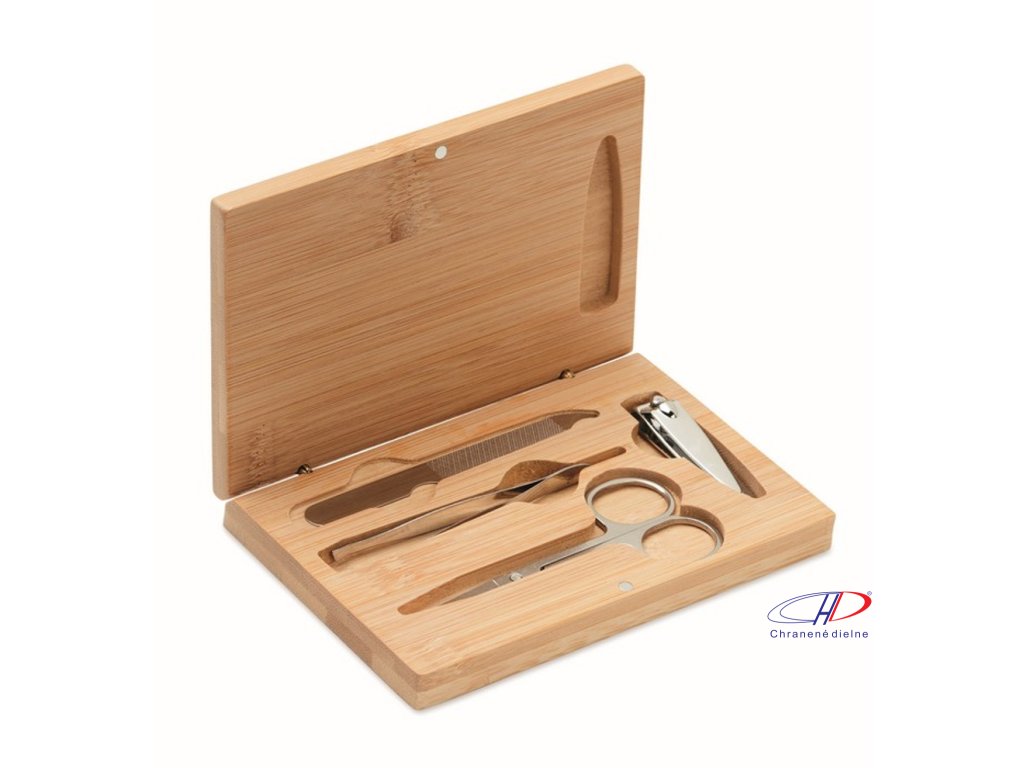 4-dielna manikúra z nerezovej ocele v bambusovom obale s magnetickým uzáverom. Zahnuté nožnice na nechty, klieštiky na nechty, pilník a pinzeta.Dodatočné parametre