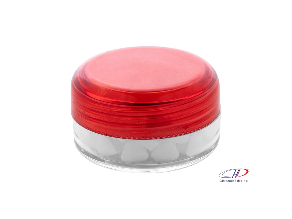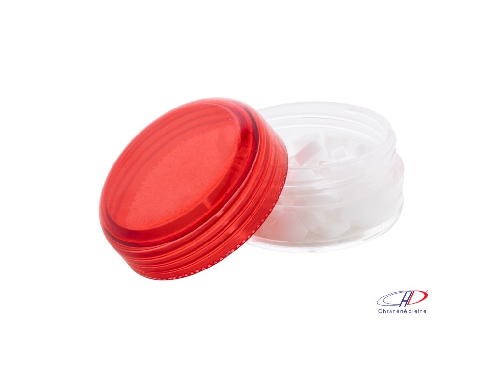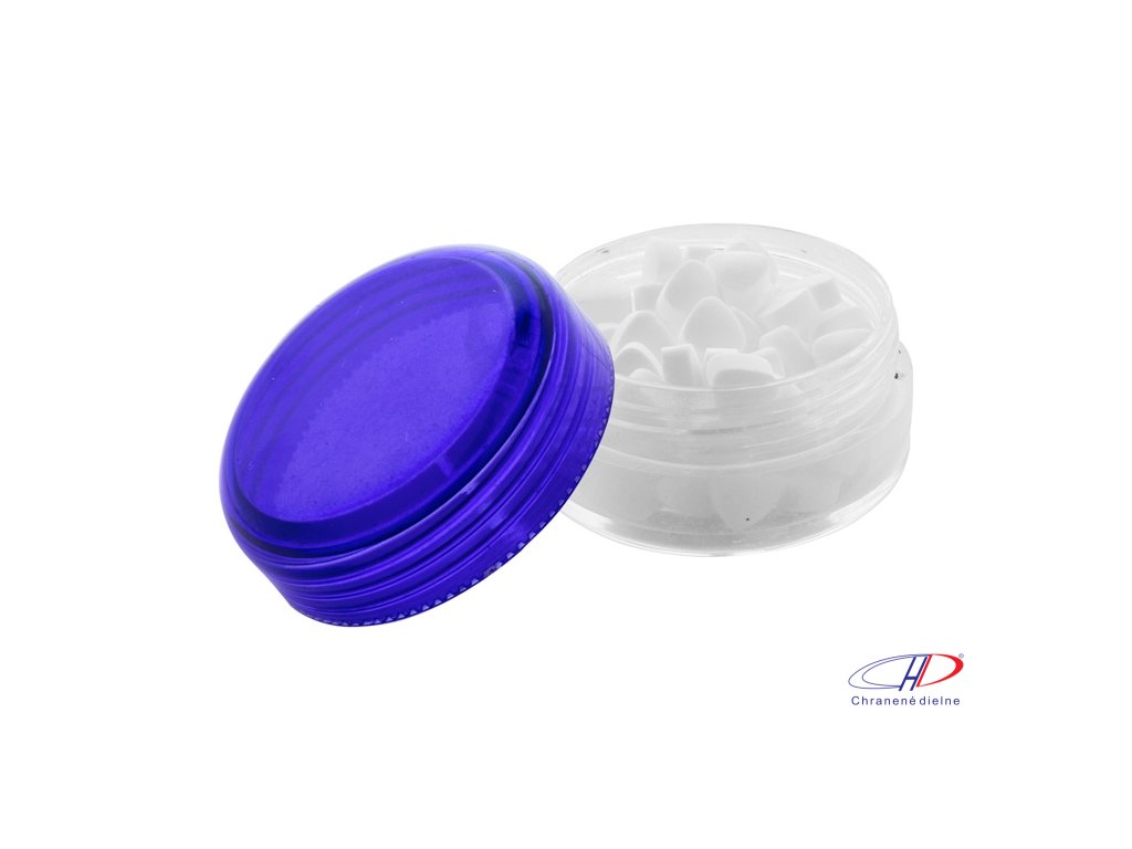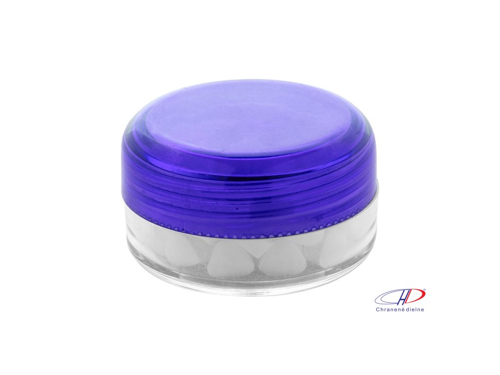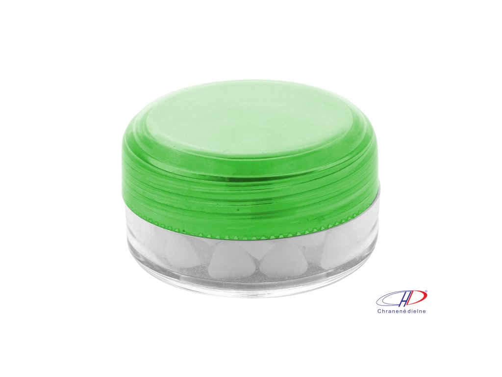 Okrúhla priehľadná plastová dóza s mintovými cukríkmi s farebným skrutkovacím viečkom. Obsahujúce cca. 12 gramov mentolových cukríkov bez cukru.Dodatočné parametre
